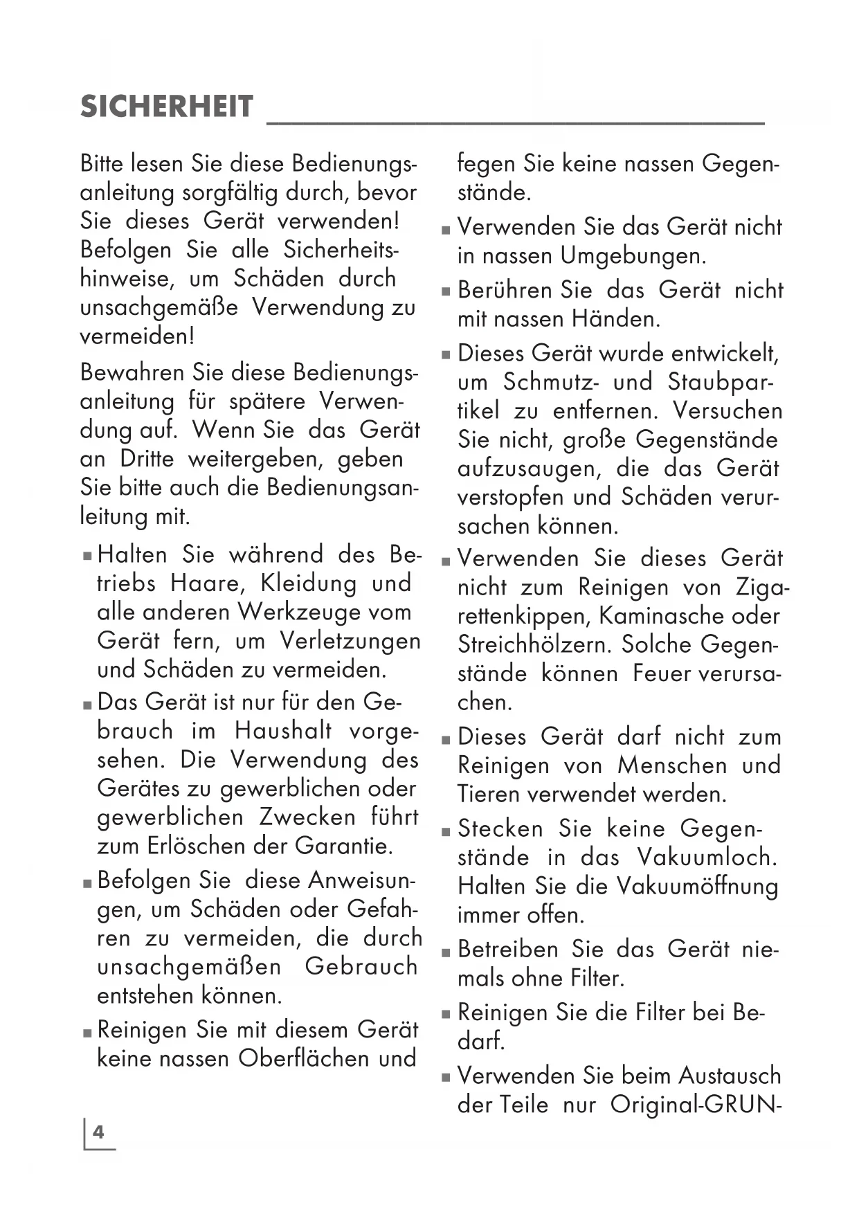 Dieses Gerät wurde entwickelt, um Schmutz- und Staubpar- tikel zu entfernen. Versuchen Sie nicht, große Gegenstände aufzusaugen, die das Gerät verstopfen und Schäden verur- sachen können.