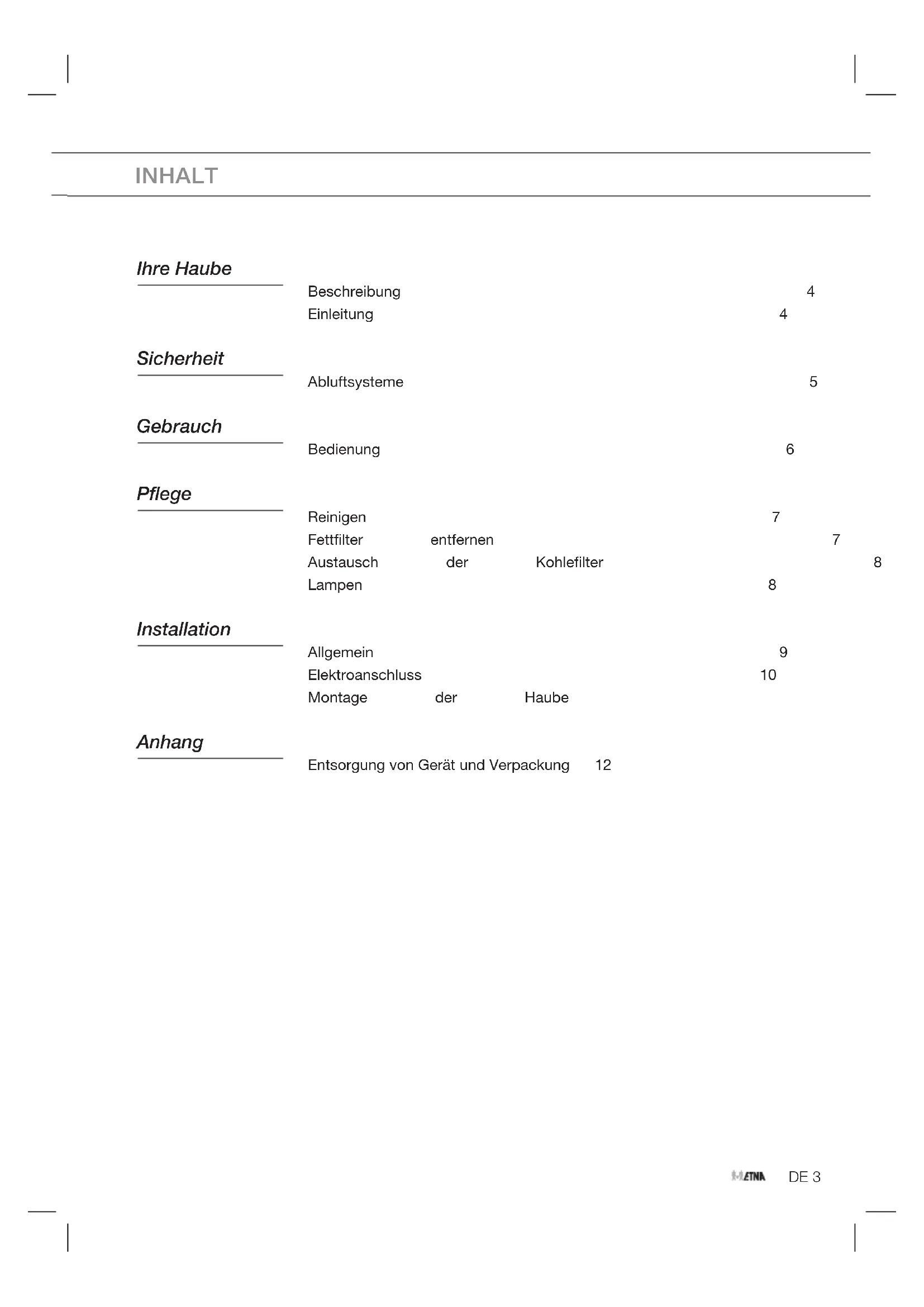 - CFRP-freies Polystyrol (PS-Hartschaum). Diese Werkstoffe sind ordnungsgemäß und gemäß den behördlichen Vorschriften zu entsorgen. Zur Erinnerung an die Verpflichtung, die Elektrohaushaltsgeräte getrennt zu beseitigen, ist das Produkt mit einer durchgestrichenen Mülltonne gekennzeichnet. Dies bedeutet, dass das Produkt am Ende seiner Nutzungszeit nicht zusammen mit dem Hausabfall beseitigt werden darf. Stattdessen muss es zur Entsorgung bei einer von den städtischen Behörden eingerichteten Sammelstelle oder zu einem Fachhändler, der einen Rücknahmeservice anbietet, gebracht werden. Die getrennte Entsorgung eines Haushaltsgerätes vermeidet mögliche negative Auswirkungen auf die Umwelt und die menschliche Gesundheit, die eine nicht vorschriftsmäßige Entsorgung zur Folge hat. Außerdem wird die Wiederverwertung der Materialien ermöglicht, aus denen das Gerät besteht, was wiederum eine bedeutende Einsparung an Energie und Ressourcen mit sich bringt.EN 3 CONTENTS Your canopy hood Description 4 Introduction 4 Safety Extraction systems 5 Use Controls 6 Maintenance Cleaning 7 Grease filters 7 Carbon filter 8 Lighting 8 Installation General 9 Electrical connection 10 Mounting 11 Appendix Disposal 12EN 4 Description