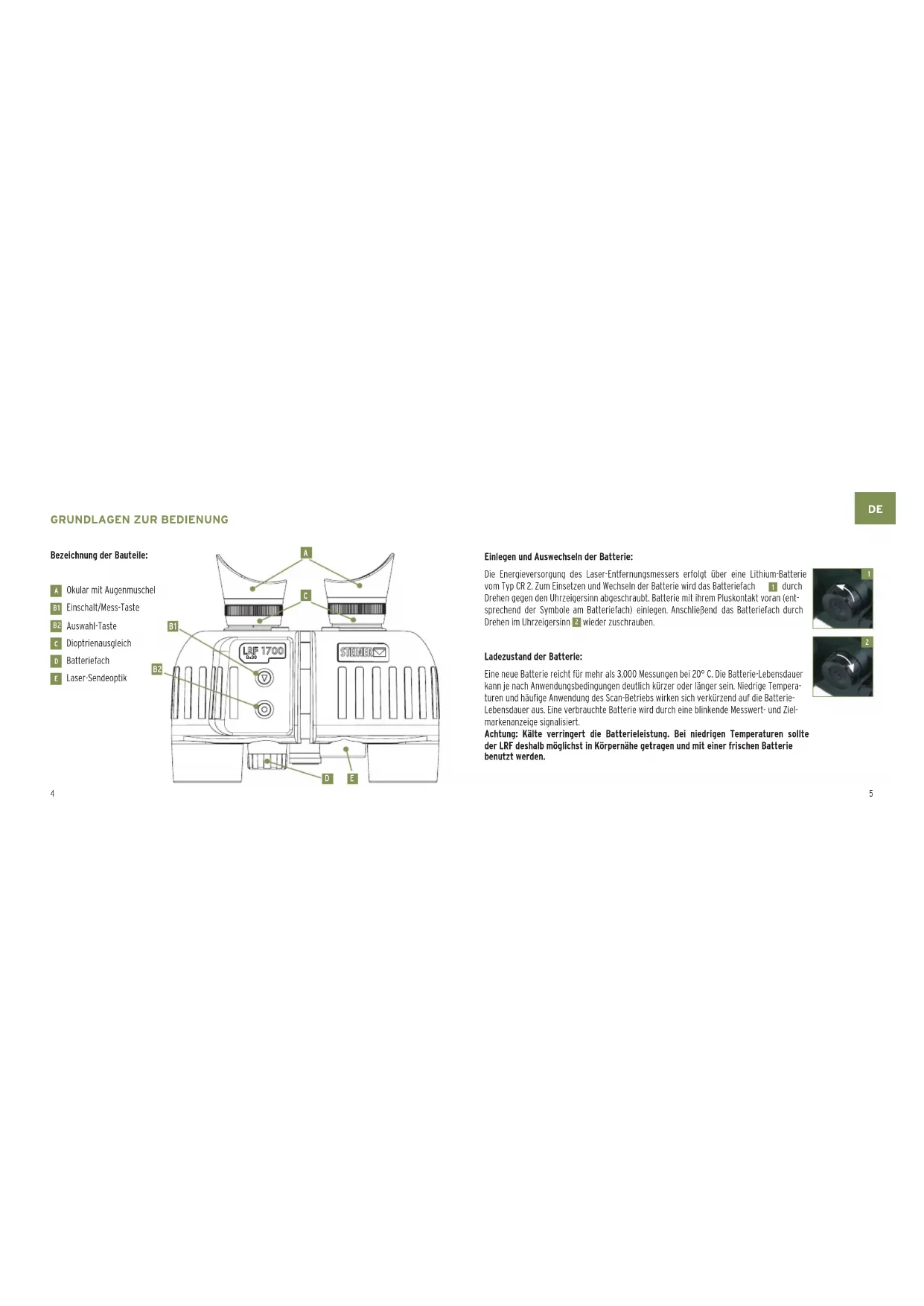 Einlegen und Auswechseln der Batterie: Die Energieversorgung des Laser-Entfernungsmessers erfolgt über eine Lithium-Batterie vom Typ CR 2. Zum Einsetzen und Wechseln der Batterie wird das Batteriefach
