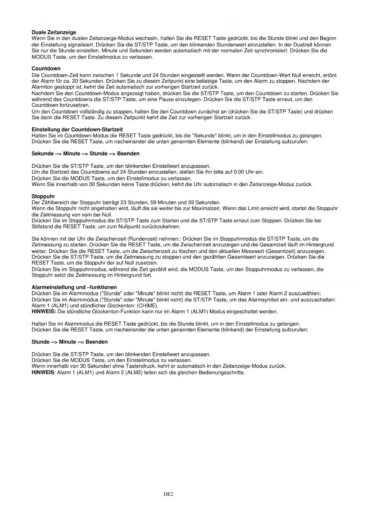 Wenn Sie in den dualen Zeitanzeige-Modus wechseln, halten Sie die RESET Taste gedrückt, bis die Stunde blinkt und den Beginn der Einstellung signalisiert. Drücken Sie die ST/STP Taste, um den blinkenden Stundenwert einzustellen. In der Dualzeit konnen Sie nur die Stunde einstellen. Minute und Sekunden werden automatisch mit der normalen Zeit synchronisiert. Drücken Sie die MODUS Taste, um den Einstellmodus zu verlassen.