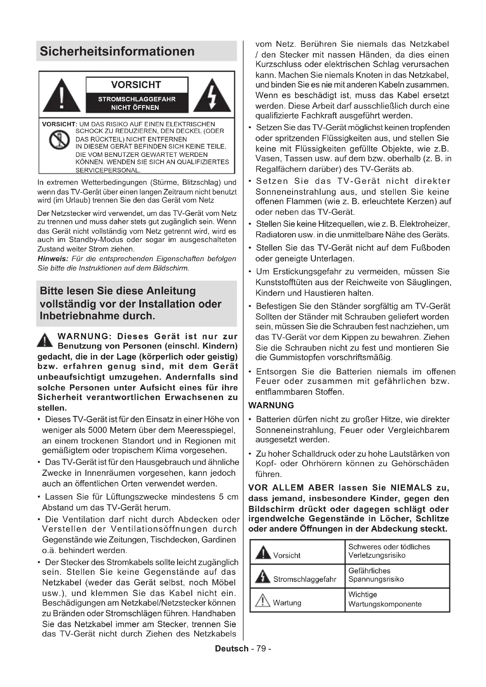 Vorsicht. Bitte beachten Sie die Bedienungsanleitung: Der markierte Bereich bzw. die markierten Bereiche enthalten durch den Benutzer auszutauschende Knopfzellenbatterien. CLASS 1 LASER PRODUCT Gerät der Laserklasse 1: Dieses Gerät enthält eine Laserquelle der Klasse 1, die unter vernünftigerweise vorhersehbaren Betriebsbedingungen ungefährlich ist. WARNUNG Batterien dürfen nicht verschluckt werden, es besteht chemische Verätzungsgefahr. Dieses Gerät bzw. das zum Gerät mitgelieferte Zube- hör enthält möglicherweise eine Knopfzellenbatterie. Wenn die Knopfzellenbatterie verschluckt wird, führt dies innerhalb 2 Stunden zu schweren internen Ver- ätzungen mit möglicher Todesfolge. Halten Sie gebrauchte und neue Batterien von Kin- dern fern. Wenn das Batteriefach nicht sicher geschlossen ist, stoppen Sie die Verwendung des Geräts und halten Sie Kinder fern. Falls Sie den Verdacht haben, dass Batterien ver- schluckt wurden oder in irgendeinen Körperteil platziert wurde, suchen Sie sofort medizinische Hilfe auf. – – – – – – – – – – – – Warnung Stabilitätsgefahr Ein TV-Gerät kann umfallen und dabei ernste Ver- letzungen mit möglicher Todesfolge verursachen. Viele Verletzungen, insbesondere bei Kindern, können vermieden werden, wenn die folgenden einfachen Vorsichtsmaßnahmen getroen werden: