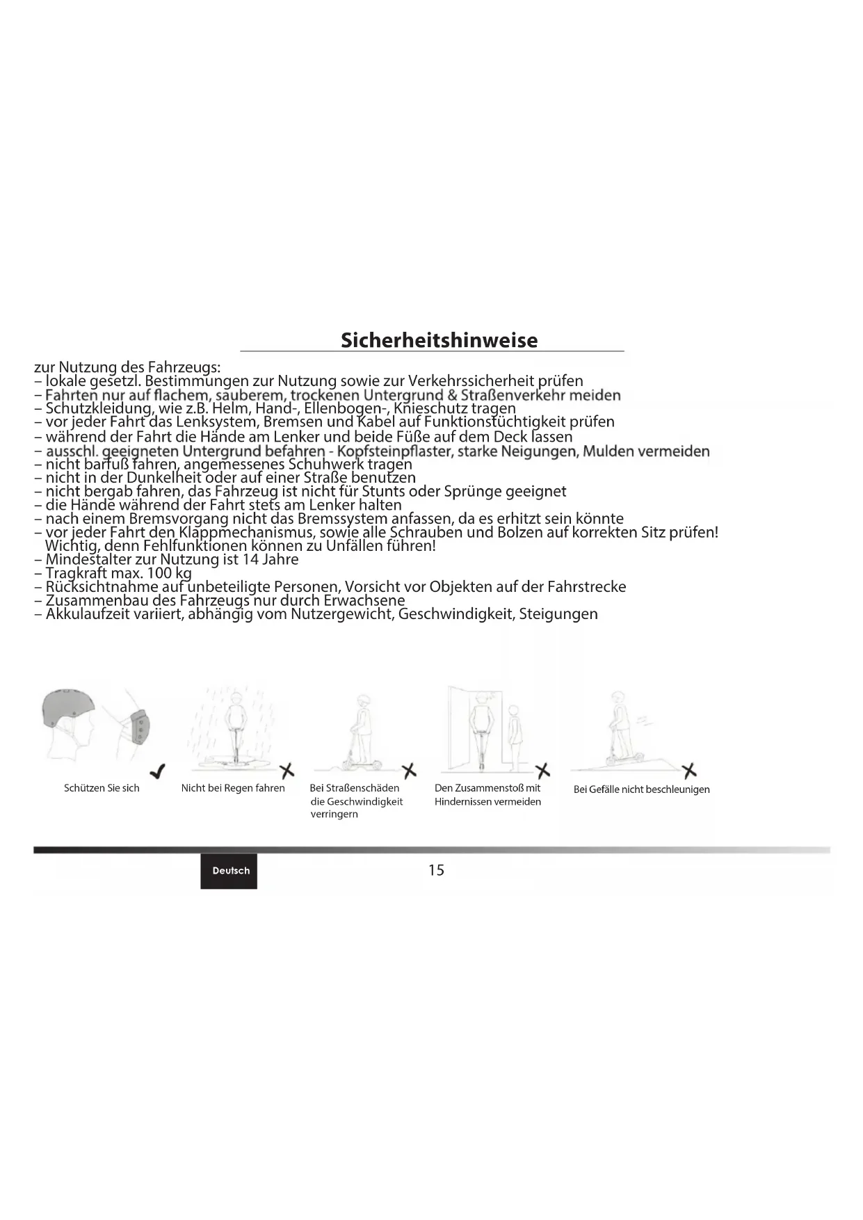 – nicht bergab fahren, das Fahrzeug ist nicht für Stunts oder Sprünge geeignet – die Hände während der Fahrt stets am Lenker halten – nach einem Bremsvorgang nicht das Bremssystem anfassen, da es erhitzt sein könnte – vor jeder Fahrt den Klappmechanismus, sowie alle Schrauben und Bolzen auf korrekten Sitz prüfen! – Mindestalter zur Nutzung ist 14 Jahre – Tragkraft max. 100 kg – Rücksichtnahme auf unbeteiligte Personen, Vorsicht vor Objekten auf der Fahrstrecke – Zusammenbau des Fahrzeugs nur durch Erwachsene – Akkulaufzeit variiert, abhängig vom Nutzergewicht, Geschwindigkeit, Steigungen Den Zusammenstoß mit Hindernissen vermeiden Schützen Sie sich Bei Straßenschäden die Geschwindigkeit verringern Nicht bei Regen fahren Wichtig, denn Fehlfunktionen können zu Unfällen führen! Bei Gefälle nicht beschleunigen16