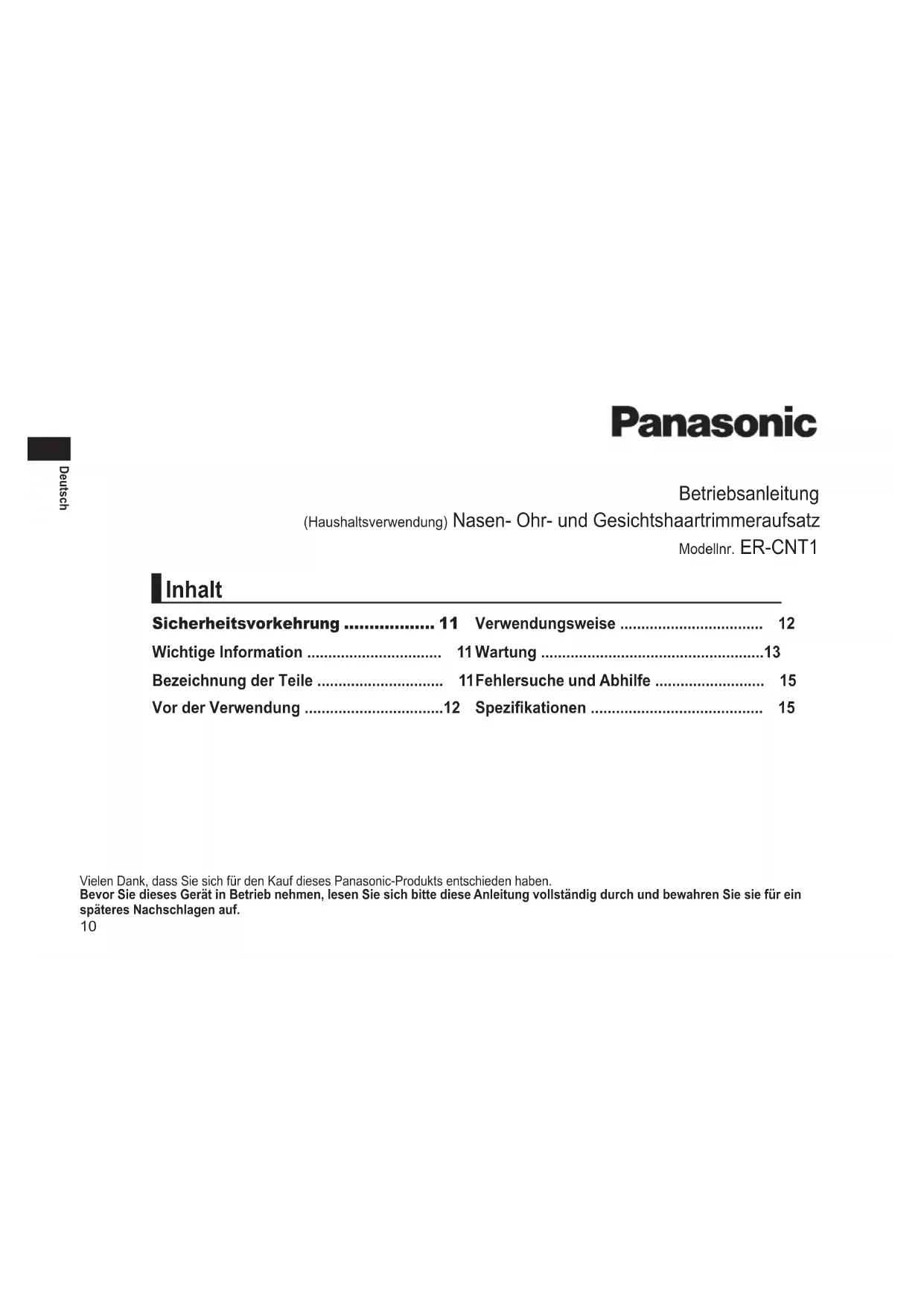 - the“ ” mark of the head.9 English Removing and mounting the blade (Fig.11) ►Outer blade Remove Rotate the outer blade in the direction of the arrow and remove the blade. (1) Mount Insert the head’s shaft (d) into the hole of the inner blade. Rotatetheouterbladetoalignits“ ”markwiththe“ ” mark of the head. (2) ►Inner blade Remove Pull to remove the inner blade. Mount Insert the inner blade straight into the outer blade. Troubleshooting Problem Action The cutting performance has reduced. Replace the blade. Clean the inner blade. There is an odd odour. Blade does not move/ rotate smoothly. The suction power is low. Clean the trimmings box. Close the water inlet. If the problems still cannot be solved, contact your dealer or a service centre authorized by Panasonic for repair. Specications Airborne Acoustical Noise 62 (dB (A) re 1 pW) This product is intended for household use only.10 Deutsch Betriebsanleitung (Haushaltsverwendung) Nasen‑ Ohr‑ und Gesichtshaartrimmeraufsatz Modellnr. ER‑CNT1 Vielen Dank, dass Sie sich für den Kauf dieses Panasonic‑Produkts entschieden haben. Bevor Sie dieses Gerät in Betrieb nehmen, lesen Sie sich bitte diese Anleitung vollständig durch und bewahren Sie sie für ein späteresNachschlagenauf. Sicherheitsvorkehrung p. 11