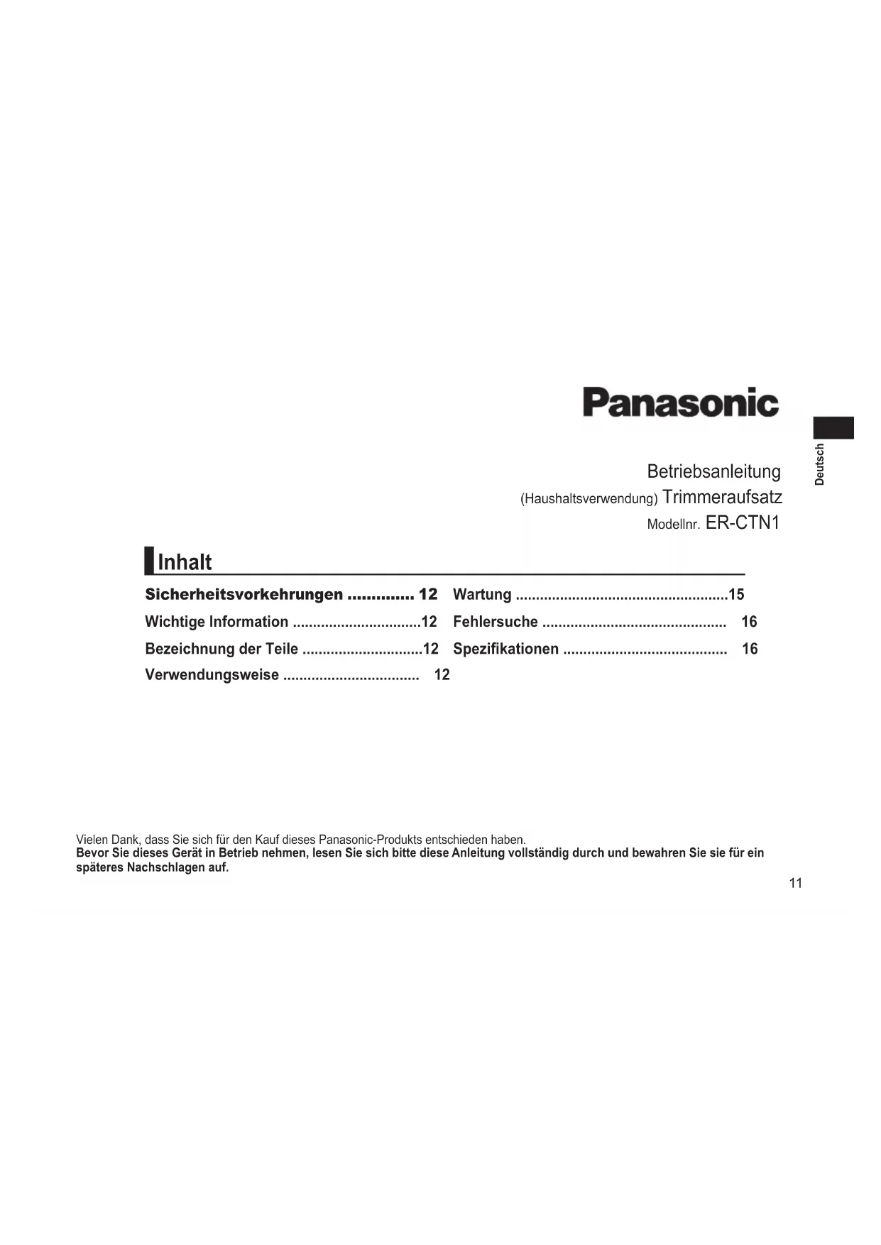 - (See page 9.) Makes a loud sound. Clean the blade and apply lubrication oil. (See page 9.) Conrmthatthebladeisproperly attached. If the problems still cannot be solved, contact your dealer or a service centre authorized by Panasonic for repair. Specications Airborne Acoustical Noise 67 (dB (A) re 1 pW) This product is intended for household use only.11 Deutsch Betriebsanleitung (Haushaltsverwendung) Trimmeraufsatz Modellnr. ER‑CTN1 Vielen Dank, dass Sie sich für den Kauf dieses Panasonic‑Produkts entschieden haben. Bevor Sie dieses Gerät in Betrieb nehmen, lesen Sie sich bitte diese Anleitung vollständig durch und bewahren Sie sie für ein späteresNachschlagenauf. Sicherheitsvorkehrungen p. 12