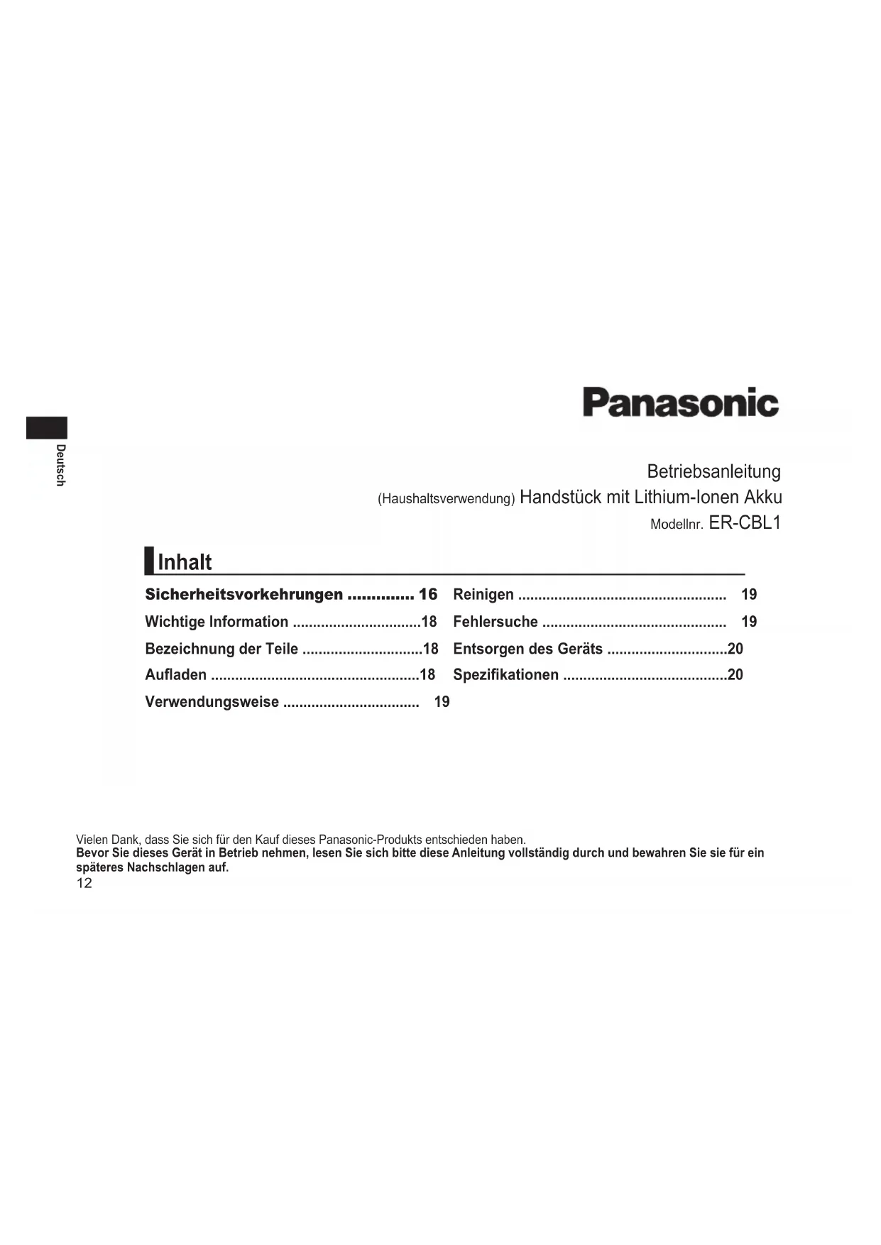 BEDIENUNGSANLEITUNG ERCBL1 PANASONIC
