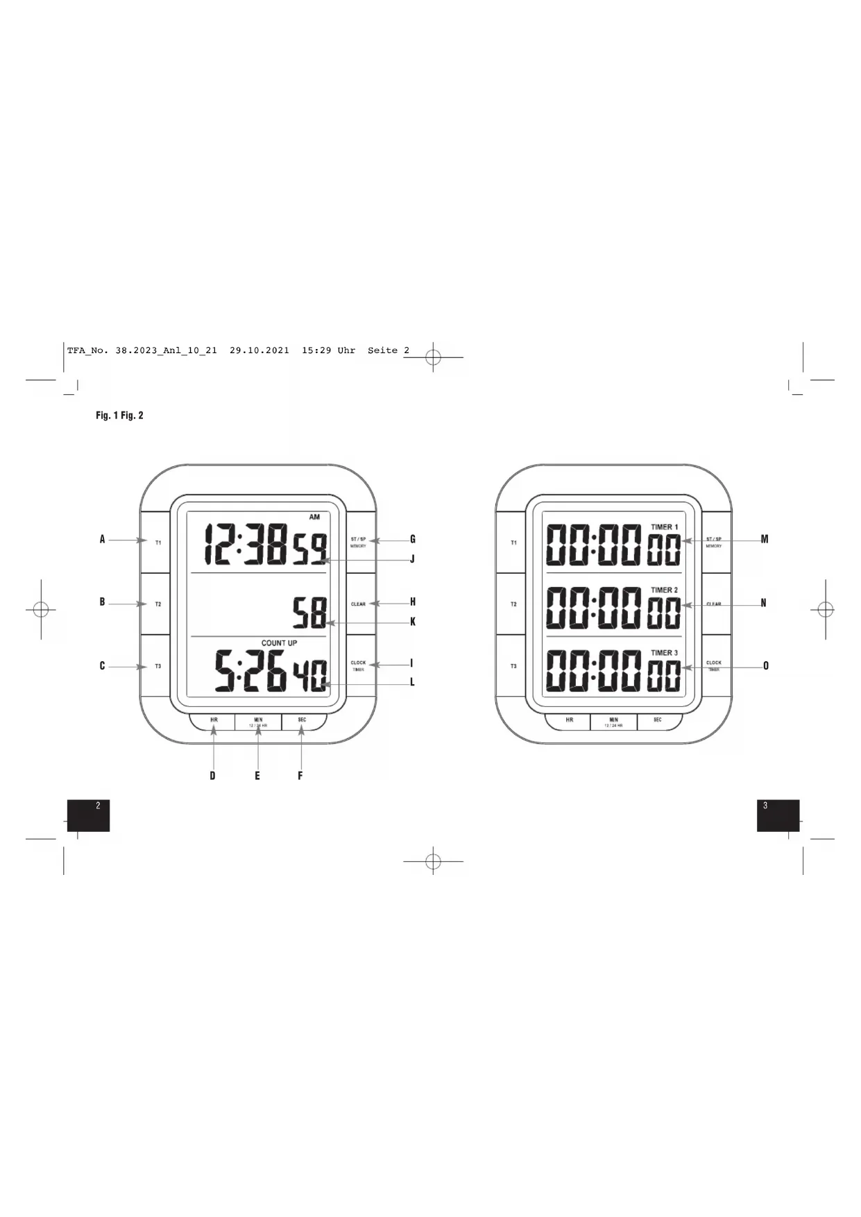 Im Uhrzeit-Modus (Fig. 1) J: Oberes Display: Uhrzeit K: Mittleres Display: 1/100 Sekunden (Stoppuhr) L: Unteres Display: Stunden/Minuten/Sekunden (Stoppuhr) Im Timer-Modus (Fig. 2) M: Oberes Display: TIMER 1 N: Mittleres Display: TIMER 2 O: Unteres Display: TIMER 3