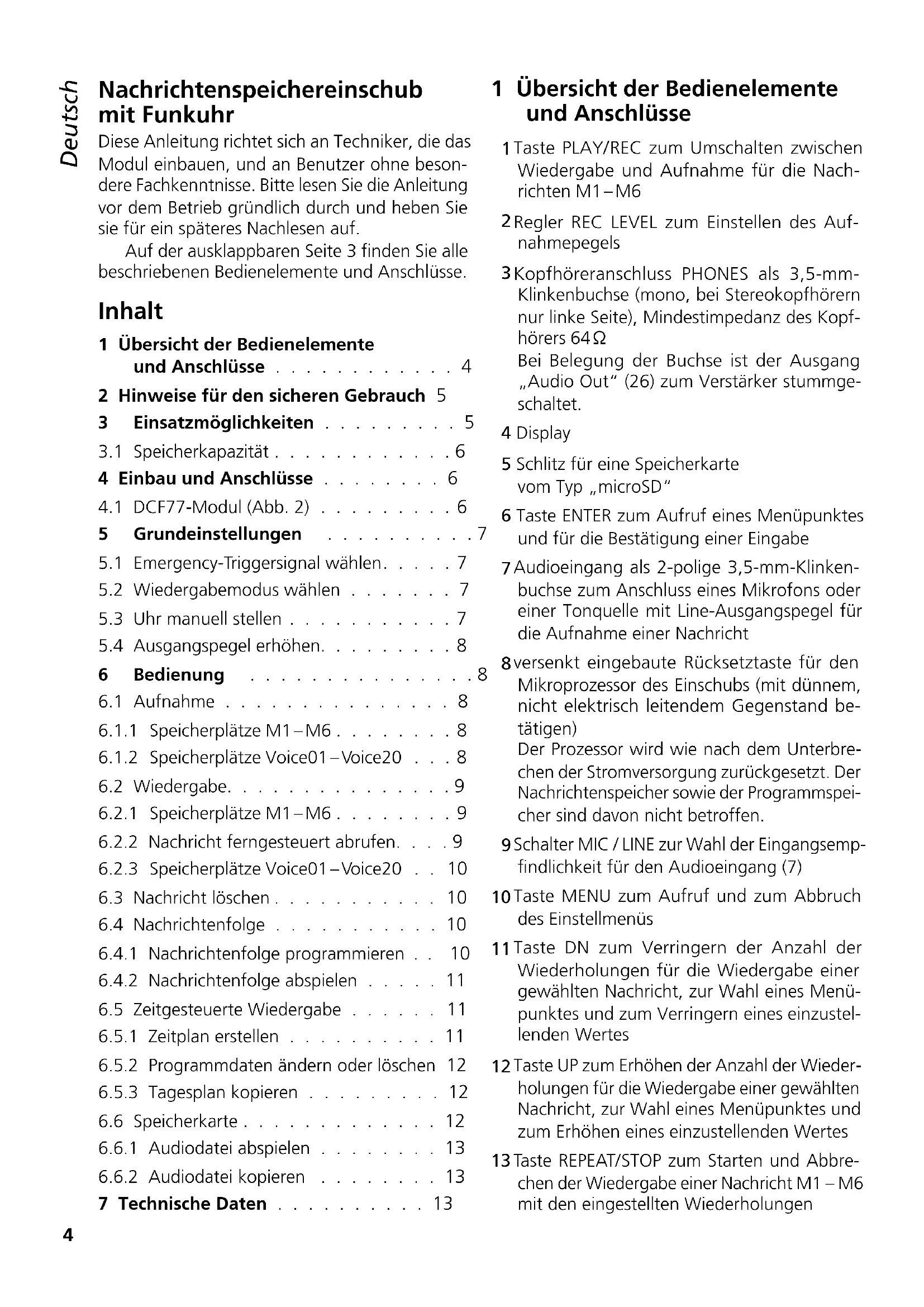 - ➂➁4 English English Page Contents Français Français Page Table des matières Italiano Italiano Pagina Indice Español Español Página Contenidos Nederlands Nederlands Pagina Inhoud Polski Polski Strona Spis treści Nachrichtenspeichereinschub mitFunkuhr Diese Anleitung richtet sich an Techniker, die das Modul einbauen, und an Benutzer ohne beson- dere Fachkenntnisse. Bitte lesen Sie die Anleitung vor dem Betrieb gründlich durch und heben Sie sie für ein späteres Nachlesen auf. Auf der ausklappbaren Seite 3 finden Sie alle beschriebenen Bedienelemente und Anschlüsse. Deutsch Deutsch Seite Inhalt Deutsch Inhalt 1 Übersicht der Bedienelemente undAnschlüsse p. 4