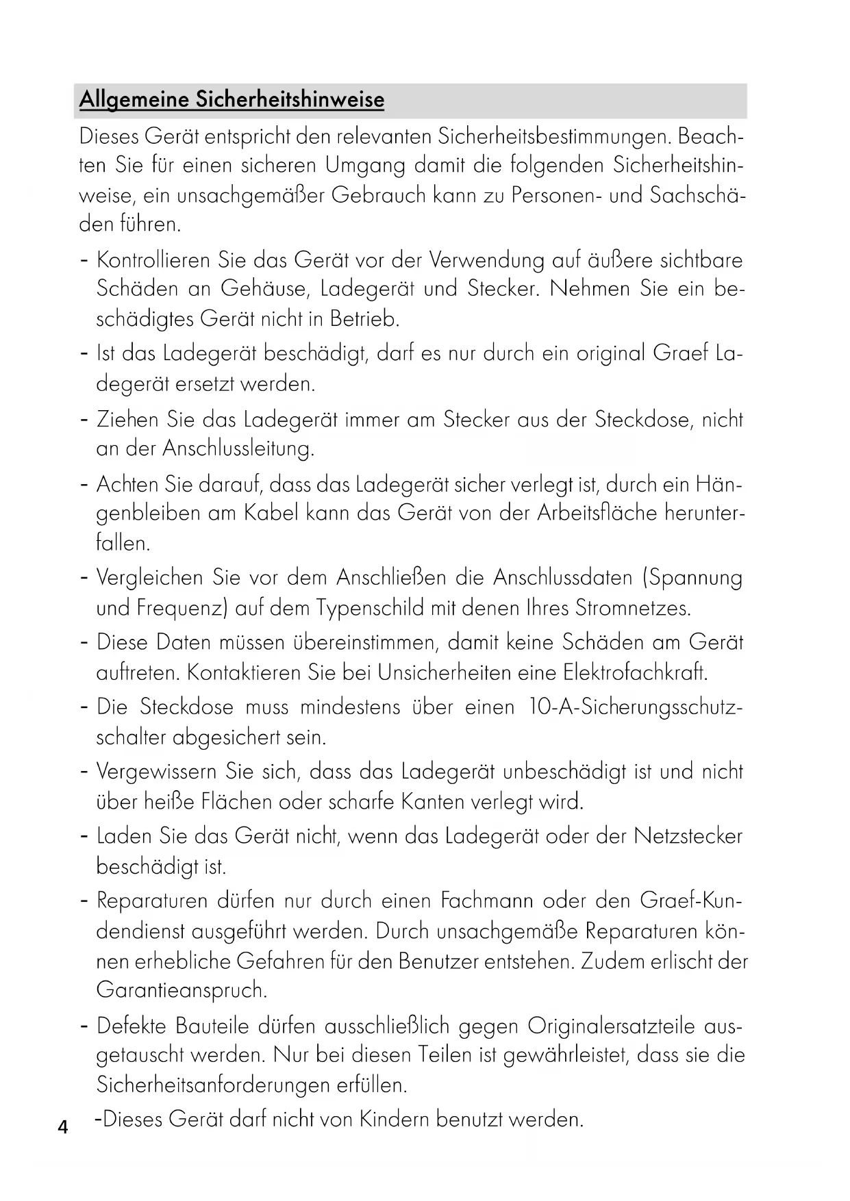 - Gewährleistung Allgemeine Sicherheitshinweise Dieses Gerät entspricht den relevanten Sicherheitsbestimmungen. Beach- ten Sie für einen sicheren Umgang damit die folgenden Sicherheitshin- weise, ein unsachgemäßer Gebrauch kann zu Personen- und Sachschä- den führen. - Kontrollieren Sie das Gerät vor der Verwendung auf äußere sichtbare Schäden an Gehäuse, Ladegerät und Stecker. Nehmen Sie ein be- schädigtes Gerät nicht in Betrieb. - Ist das Ladegerät beschädigt, darf es nur durch ein original Graef La- degerät ersetzt werden. - Ziehen Sie das Ladegerät immer am Stecker aus der Steckdose, nicht an der Anschlussleitung. - Achten Sie darauf, dass das Ladegerät sicher verlegt ist, durch ein Hän- genbleiben am Kabel kann das Gerät von der Arbeitsfläche herunter- fallen. - Vergleichen Sie vor dem Anschließen die Anschlussdaten (Spannung und Frequenz) auf dem Typenschild mit denen Ihres Stromnetzes. - Diese Daten müssen übereinstimmen, damit keine Schäden am Gerät auftreten. Kontaktieren Sie bei Unsicherheiten eine Elektrofachkraft. - Die Steckdose muss mindestens über einen 10-A-Sicherungsschutz- schalter abgesichert sein. - Vergewissern Sie sich, dass das Ladegerät unbeschädigt ist und nicht über heiße Flächen oder scharfe Kanten verlegt wird. - Laden Sie das Gerät nicht, wenn das Ladegerät oder der Netzstecker beschädigt ist. - Reparaturen dürfen nur durch einen Fachmann oder den Graef-Kun- dendienst ausgeführt werden. Durch unsachgemäße Reparaturen kön- nen erhebliche Gefahren für den Benutzer entstehen. Zudem erlischt der Garantieanspruch. - Defekte Bauteile dürfen ausschließlich gegen Originalersatzteile aus- getauscht werden. Nur bei diesen Teilen ist gewährleistet, dass sie die Sicherheitsanforderungen erfüllen. - Dieses Gerät darf nicht von Kindern benutzt werden.5 p. 144