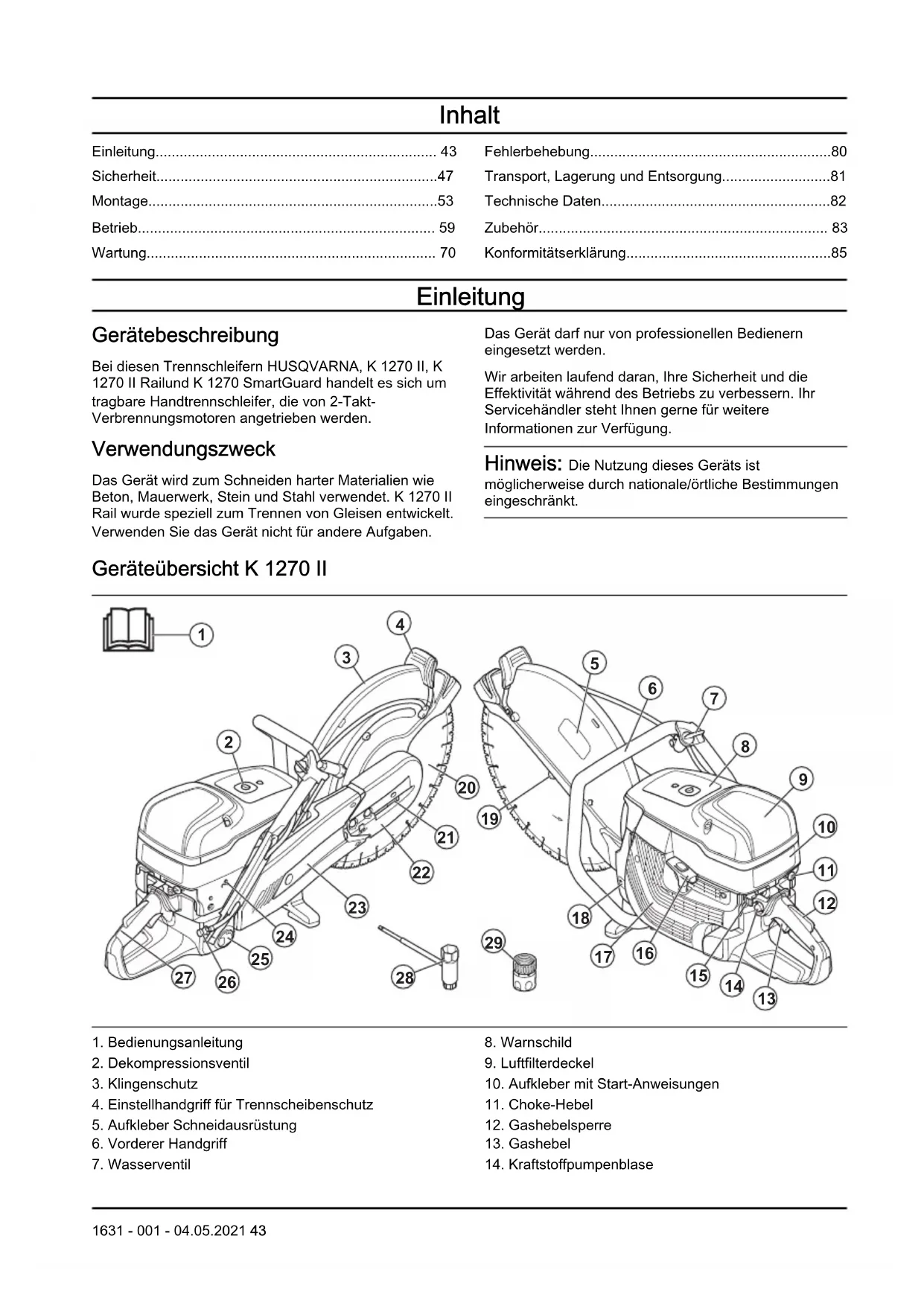 - Konformitätserklärung Einleitung Gerätebeschreibung Bei diesen Trennschleifern HUSQVARNA, K 1270 II, K 1270 II Railund K 1270 SmartGuard handelt es sich um tragbare Handtrennschleifer, die von 2-Takt- Verbrennungsmotoren angetrieben werden. Verwendungszweck Das Gerät wird zum Schneiden harter Materialien wie Beton, Mauerwerk, Stein und Stahl verwendet. K 1270 II Rail wurde speziell zum Trennen von Gleisen entwickelt. Verwenden Sie das Gerät nicht für andere Aufgaben. Das Gerät darf nur von professionellen Bedienern eingesetzt werden. Wir arbeiten laufend daran, Ihre Sicherheit und die Effektivität während des Betriebs zu verbessern. Ihr Servicehändler steht Ihnen gerne für weitere Informationen zur Verfügung. Hinweis: Die Nutzung dieses Geräts ist möglicherweise durch nationale/örtliche Bestimmungen eingeschränkt. Geräteübersicht K 1270 II p. 85
