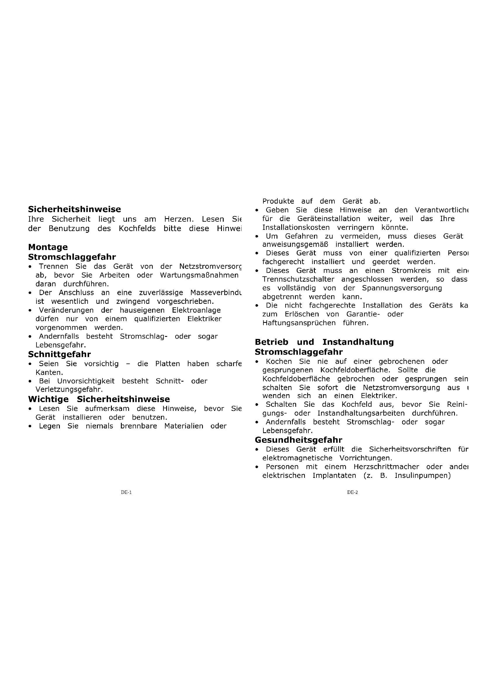 - Utilizzare pentole con diametro corrispondente al grafico della zona selezionata. elettrica, arrotondata ai 5 mm più viciniDE-1 Sicherheitshinweise Ihre Sicherheit liegt uns am Herzen. Lesen Sie vor der Benutzung des Kochfelds bitte diese Hinweise. Montage Stromschlaggefahr
