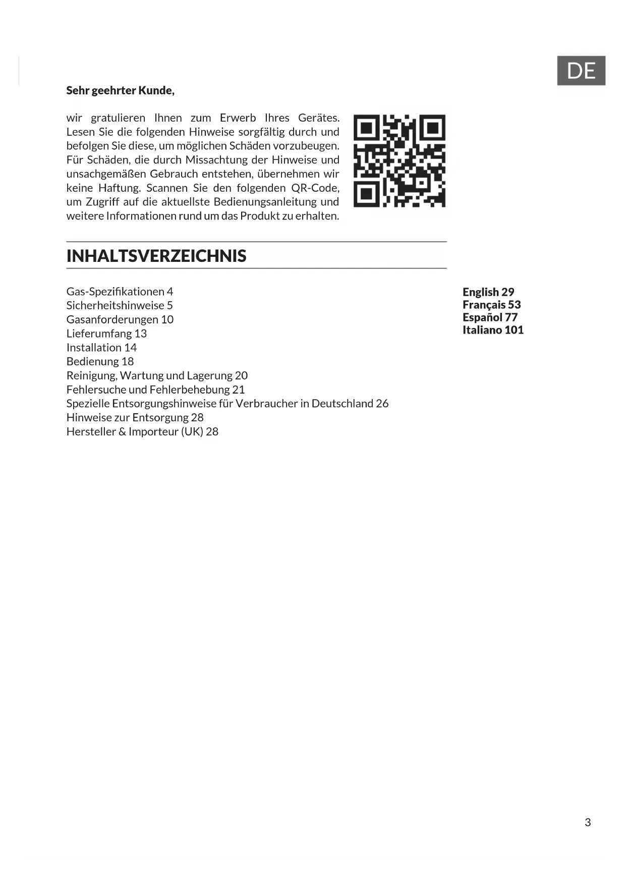 Sehr geehrter Kunde, wir gratulieren Ihnen zum Erwerb Ihres Gerätes. Lesen Sie die folgenden Hinweise sorgfältig durch und befolgen Sie diese, um möglichen Schäden vorzubeugen. Für Schäden, die durch Missachtung der Hinweise und unsachgemäßen Gebrauch entstehen, übernehmen wir keine Haftung. Scannen Sie den folgenden QR-Code, um Zugriff auf die aktuellste Bedienungsanleitung und weitere Informationen rund um das Produkt zu erhalten. INHALTSVERZEICHNIS Gas-Spezikationen 4 Sicherheitshinweise 5 Gasanforderungen 10 Lieferumfang 13 Installation 14 Bedienung 18 Reinigung, Wartung und Lagerung 20 Fehlersuche und Fehlerbehebung 21 Spezielle Entsorgungshinweise für Verbraucher in Deutschland 26 Hinweise zur Entsorgung 28 Hersteller & Importeur (UK) 28 English 29 Français 53 Español 77 Italiano 1014