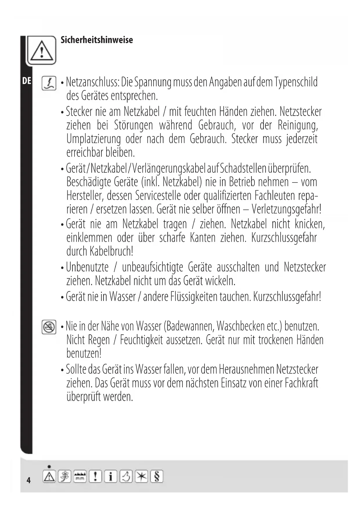 - Nie in der Nähe von Wasser (Badewannen, Waschbecken etc.) benutzen. Nicht Regen / Feuchtigkeit aussetzen. Gerät nur mit trockenen Händen benutzen!5 Sicherheitshinweise