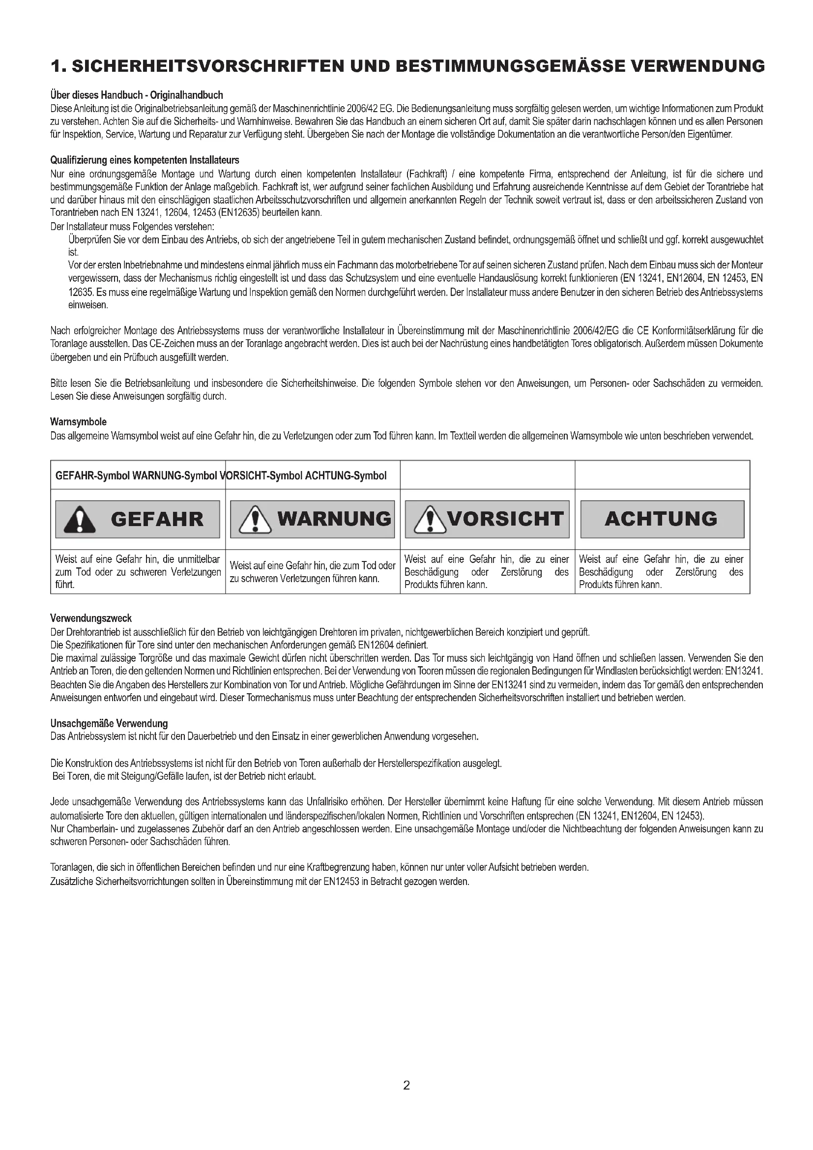 - 14. KONFORMITÄTSERKLÄRUNG Über dieses Handbuch - Originalhandbuch Diese Anleitung ist die Originalbetriebsanleitung gemäß der Maschinenrichtlinie 2006/42 EG. Die Bedienungsanleitung muss sorgfältig gelesen werden, um wichtige Informationen zum Produkt zu verstehen. Achten Sie auf die Sicherheits- und Warnhinweise. Bewahren Sie das Handbuch an einem sicheren Ort auf, damit Sie später darin nachschlagen können und es allen Personen für Inspektion, Service, Wartung und Reparatur zur Verfügung steht. Übergeben Sie nach der Montage die vollständige Dokumentation an die verantwortliche Person/den Eigentümer. Qualizierung eines kompetenten Installateurs Nur eine ordnungsgemäße Montage und Wartung durch einen kompetenten Installateur (Fachkraft) / eine kompetente Firma, entsprechend der Anleitung, ist für die sichere und bestimmungsgemäße Funktion der Anlage maßgeblich. Fachkraft ist, wer aufgrund seiner fachlichen Ausbildung und Erfahrung ausreichende Kenntnisse auf dem Gebiet der Torantriebe hat und darüber hinaus mit den einschlägigen staatlichen Arbeitsschutzvorschriften und allgemein anerkannten Regeln der Technik soweit vertraut ist, dass er den arbeitssicheren Zustand von Torantrieben nach EN 13241, 12604, 12453 (EN12635) beurteilen kann.Der Installateur muss Folgendes verstehen: ÜberprüfenSievordemEinbaudesAntriebs,obsichderangetriebeneTeilingutemmechanischenZustandbendet,ordnungsgemäßöffnetundschließtundggf.korrektausgewuchtet ist. Vor der ersten Inbetriebnahme und mindestens einmal jährlich muss ein Fachmann das motorbetriebene Tor auf seinen sicheren Zustand prüfen. Nach dem Einbau muss sich der Monteur vergewissern, dass der Mechanismus richtig eingestellt ist und dass das Schutzsystem und eine eventuelle Handauslösung korrekt funktionieren (EN 13241, EN12604, EN 12453, EN 12635. Es muss eine regelmäßige Wartung und Inspektion gemäß den Normen durchgeführt werden. Der Installateur muss andere Benutzer in den sicheren Betrieb des Antriebssystems einweisen. Nach erfolgreicher Montage des Antriebssystems muss der verantwortliche Installateur in Übereinstimmung mit der Maschinenrichtlinie 2006/42/EG die CE Konformitätserklärung für die Toranlage ausstellen. Das CE-Zeichen muss an der Toranlage angebracht werden. Dies ist auch bei der Nachrüstung eines handbetätigten Tores obligatorisch. Außerdem müssen Dokumente übergeben und ein Prüfbuch ausgefüllt werden. Bitte lesen Sie die Betriebsanleitung und insbesondere die Sicherheitshinweise. Die folgenden Symbole stehen vor den Anweisungen, um Personen- oder Sachschäden zu vermeiden. Lesen Sie diese Anweisungen sorgfältig durch.Warnsymbole Das allgemeine Warnsymbol weist auf eine Gefahr hin, die zu Verletzungen oder zum Tod führen kann. Im Textteil werden die allgemeinen Warnsymbole wie unten beschrieben verwendet. Verwendungszweck Der Drehtorantrieb ist ausschließlich für den Betrieb von leichtgängigen Drehtoren im privaten, nichtgewerblichen Bereich konzipiert und geprüft. DieSpezikationenfürToresindunterdenmechanischenAnforderungengemäßEN12604deniert. Die maximal zulässige Torgröße und das maximale Gewicht dürfen nicht überschritten werden. Das Tor muss sich leichtgängig von Hand öffnen und schließen lassen. Verwenden Sie den Antrieb an Toren, die den geltenden Normen und Richtlinien entsprechen. Bei der Verwendung von Tooren müssen die regionalen Bedingungen für Windlasten berücksichtigt werden: EN13241. Beachten Sie die Angaben des Herstellers zur Kombination von Tor und Antrieb. Mögliche Gefährdungen im Sinne der EN13241 sind zu vermeiden, indem das Tor gemäß den entsprechenden Anweisungen entworfen und eingebaut wird. Dieser Tormechanismus muss unter Beachtung der entsprechenden Sicherheitsvorschriften installiert und betrieben werden. Unsachgemäße VerwendungDas Antriebssystem ist nicht für den Dauerbetrieb und den Einsatz in einer gewerblichen Anwendung vorgesehen. DieKonstruktiondesAntriebssystemsistnichtfürdenBetriebvonTorenaußerhalbderHerstellerspezikationausgelegt. Bei Toren, die mit Steigung/Gefälle laufen, ist der Betrieb nicht erlaubt. Jede unsachgemäße Verwendung des Antriebssystems kann das Unfallrisiko erhöhen. Der Hersteller übernimmt keine Haftung für eine solche Verwendung. Mit diesem Antrieb müssen automatisierteToredenaktuellen,gültigeninternationalenundländerspezischen/lokalenNormen,RichtlinienundVorschriftenentsprechen(EN13241,EN12604,EN12453). Nur Chamberlain- und zugelassenes Zubehör darf an den Antrieb angeschlossen werden. Eine unsachgemäße Montage und/oder die Nichtbeachtung der folgenden Anweisungen kann zu schweren Personen- oder Sachschäden führen. Toranlagen,diesichinöffentlichenBereichenbendenundnureineKraftbegrenzunghaben,könnennuruntervollerAufsichtbetriebenwerden. Zusätzliche Sicherheitsvorrichtungen sollten in Übereinstimmung mit der EN12453 in Betracht gezogen werden.GEFAHR-Symbol WARNUNG-Symbol VORSICHT-Symbol ACHTUNG-Symbol GEFAHR WARNUNG VORSICHT ACHTUNG Weist auf eine Gefahr hin, die unmittelbar zum Tod oder zu schweren Verletzungen führt.Weist auf eine Gefahr hin, die zum Tod oder zu schweren Verletzungen führen kann.Weist auf eine Gefahr hin, die zu einer Beschädigung oder Zerstörung des Produkts führen kann.Weist auf eine Gefahr hin, die zu einer Beschädigung oder Zerstörung des Produkts führen kann. p. 192