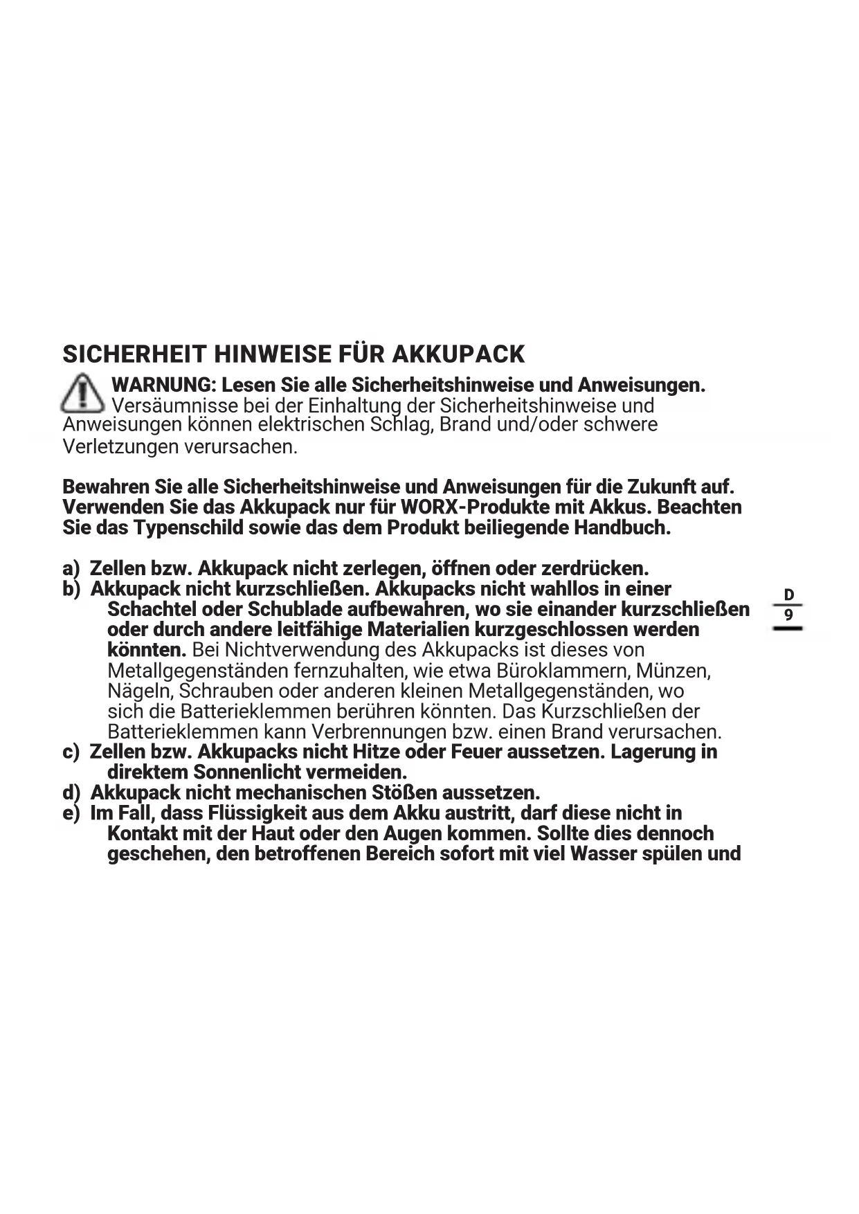 Bewahren Sie alle Sicherheitseinweise und Anweisungen für die Zukunft auf. Verwenden Sie das Akkupack nur für WORX-Produkte mit Akkus. Beachten Sie das Typenschild sowie das dem Produkt beiliegende Handbuch.