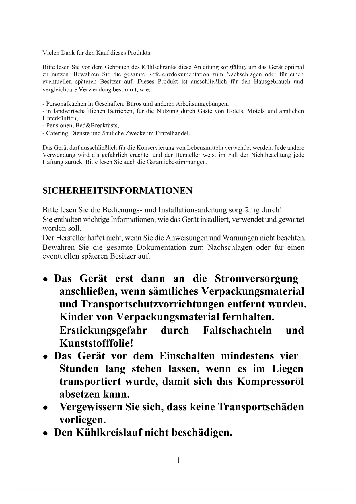 Vielen Dank für den Kauf dieses Produkts. Bitte lesen Sie vor dem Gebrauch des Kühlschranks diese Anleitung sorgfältig, um das Gerät optimal zu nutzen. Bewahren Sie die gesamte Referenzdokumentation zum Nachschlagen oder für einen eventuellen späteren Besitzer auf. Dieses Produkt ist ausschließlich für den Hausgebrauch und vergleichbare Verwendung bestimmt, wie: - Personalküchen in Geschäften, Büros und anderen Arbeitsumgebungen, - in landwirtschaftlichen Betrieben, für die Nutzung durch Gäste von Hotels, Motels und ähnlichen Unterkünften, - Pensionen, Bed&Breakfasts, - Catering-Dienste und ähnliche Zwecke im Einzelhandel. Das Gerät darf ausschließlich für die Konservierung von Lebensmitteln verwendet werden. Jede andere Verwendung wird als gefährlich erachtet und der Hersteller weist im Fall der Nichtbeachtung jede Haftung zurück. Bitte lesen Sie auch die Garantiebestimmungen. SICHERHEITSINFORMATIONEN Bitte lesen Sie die Bedienungs- und Installationsanleitung sorgfältig durch! Sie enthalten wichtige Informationen, wie das Gerät installiert, verwendet und gewartet werden soll. Der Hersteller haftet nicht, wenn Sie die Anweisungen und Warnungen nicht beachten. Bewahren Sie die gesamte Dokumentation zum Nachschlagen oder für einen eventuellen späteren Besitzer auf. ● Das Gerät erst dann an die Stromversorgung anschließen, wenn sämtliches Verpackungsmaterial und Transportschutzvorrichtungen entfernt wurden. Kinder von Verpackungsmaterial fernhalten. Erstickungsgefahr durch Faltschachteln und Kunststofffolie! ● Das Gerät vor dem Einschalten mindestens vier Stunden lang stehen lassen, wenn es im Liegen transportiert wurde, damit sich das Kompressoröl absetzen kann. ● Vergewissern Sie sich, dass keine Transportschäden vorliegen. ● Den Kühlkreislauf nicht beschädigen.