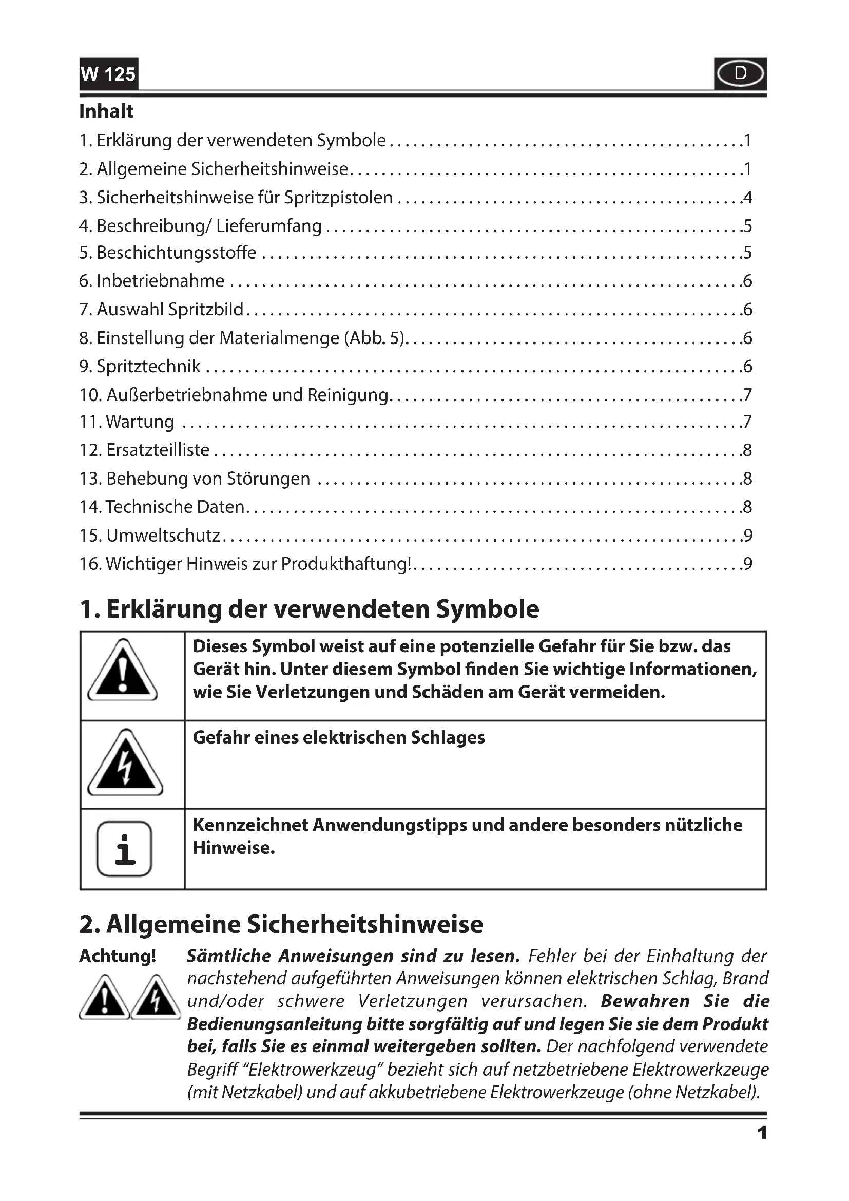 Finden Sie kostenlos die Bedienungsanleitung des Geräts W 125 WAGNER als PDF.