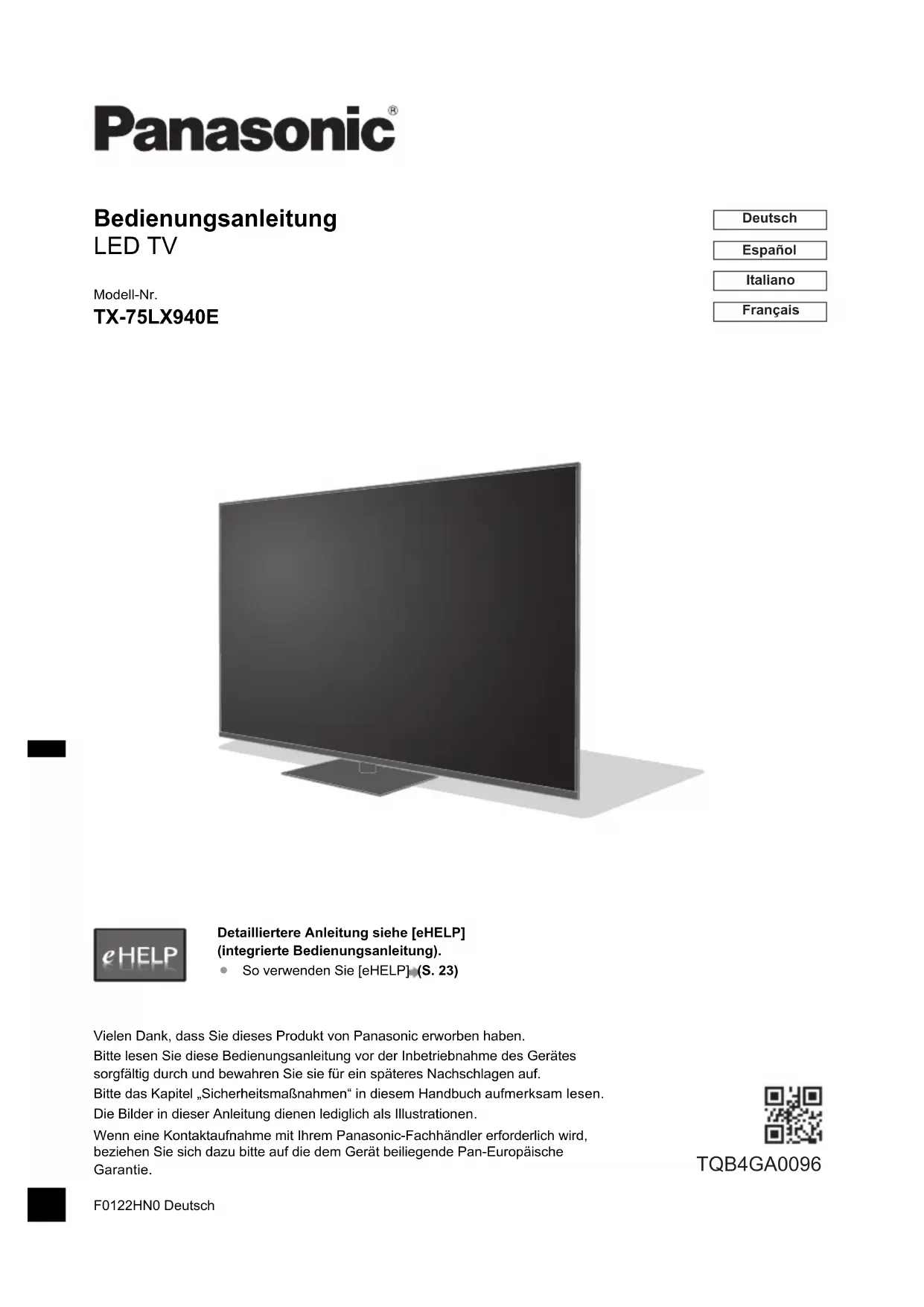Finden Sie kostenlos die Bedienungsanleitung des Geräts TX75LX940E PANASONIC als PDF.