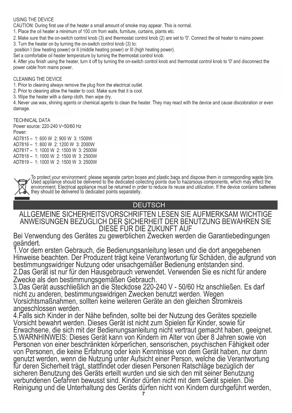 4. Verwenden Sie niemals Wachs, Glanzmittel oder chemische Mittel, um das Heizgerät zu reinigen. Sie können mit dem Gerät reagieren und Verfärbungen oder sogar Schäden verursachen. TECHNISCHE DATEN Stromquelle: 220-240 V~50/60 Hz Leistung: AD7815 – 1: 600 W 2: 900 W 3: 1500 W AD7816 – 1: 800 W 2: 1200 W 3: 2000 W AD7817 – 1: 1000 W 2: 1500 W 3: 2500 W AD7818 – 1: 1000 W 2: 1500 W 3: 2500 W AD7819 – 1: 1000 W 2: 1500 W 3: 2500 W10 Den Pappkarton im Altpapier entsorgen. Polyäthylenbeutel (PE) in dem Behälter für Kunststoff entsorgen. Das abgenutzte Gerät zum Recycling zu einer offiziellen Sammelstelle bringen, da es gefährliche Substanzen enthält, die die Umwelt gefährden können. Das Gerät sollte in einer Form abgegeben werden, die eine weitere Nutzung unmöglich macht. Wenn es Batterien enthält, sollten diese rausgenommen und separat an einer Sammelstelle abgegeben werden. Das Gerät darf nicht in den Hausmüll rausgeworfen werden!! FRANÇAIS CONSIGNES DE SECURITE. INSTRUCTIONS IMPORTANTES CONCERNANT LA SECURITE D'UTILISATION.