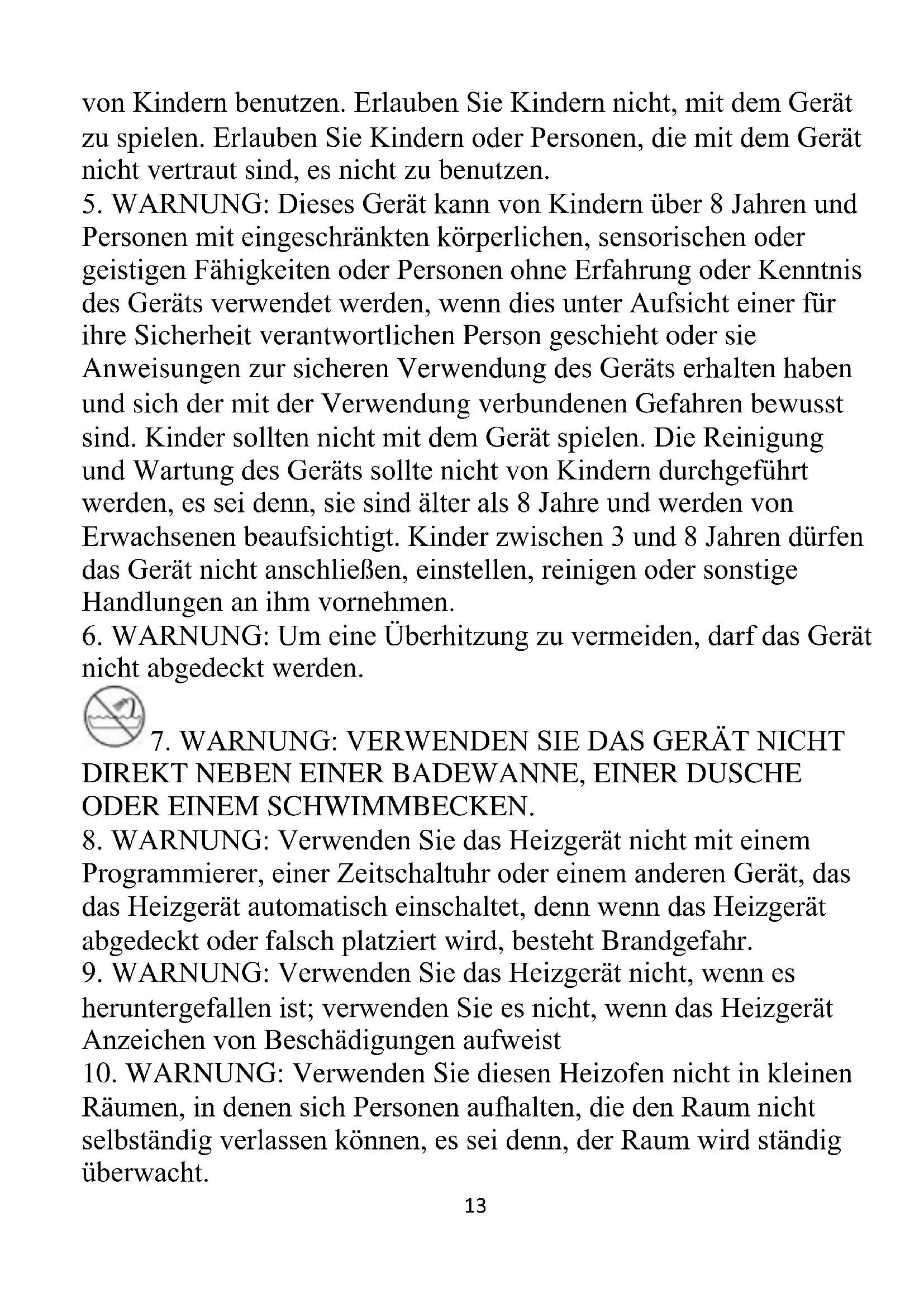WARNING: Dieses Gerät kann von Kindern über 8 Jahren und Personen mit eingeschrankten körperlichen, sensorischen oder geistigen Fähigkeiten oder Personen ohne Erfahrung oder Kenntnis des Geräts verwendet werden, wenn dies unter Aufsicht einer für ihre Sicherheit verantwortlichen Person geschieht oder sie Anweisungen zur sicheren Verwendung des Geräts erhalten haben und sich der mit der Verwendung verbundenen Gefahren bewusst sind. Kinder sollenn nicht mit dem Gerät speilen. Die Reinigung und Wartung des Geräts sollte nicht von Kindern durchgeführt werden, es sei dess, sie sind äther als 8 Jahre und werden von Erwachsenen beaufsichtigt. Kinder zwischen 3 und 8 Jahren dürfen das Gerät nicht anschlossen, einstellen, reinigen oder sonstige Handlungen an ihm vornehmen.