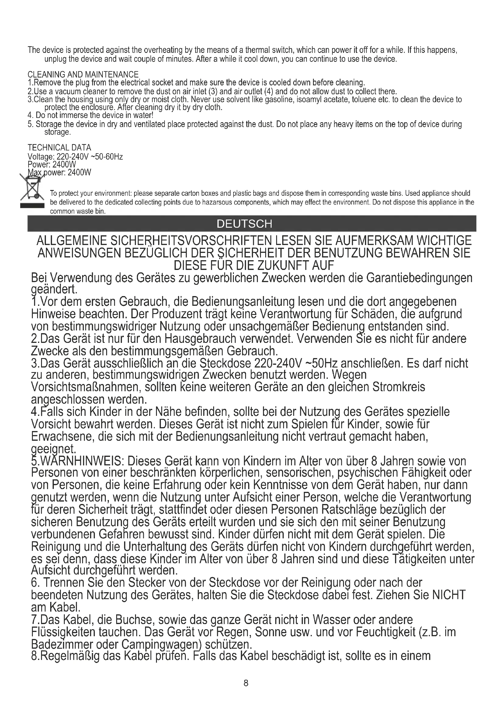 Bei Verwendung des Gerätes zu gewerblichen Zwecken werden die Garantiebedingungen geändert. 1.Vor dem ersten Gebrauch, die Bedienungsanleitung lesen und die dort angegebenen Hinweise beachten. Der Produzent trägt keine Verantwortung für Schäden, die aufgrund von bestimmungswidriger Nutzung oder unsachgemäßer Bedienung entstanden sind. 2.Das Gerät ist nur für den Hausgebrauch verwendet. Verwenden Sie es nicht für andere Zwecke als den bestimmungsgemäßen Gebrauch. 3.Das Gerät ausschließlich an die Steckdose 220-240V ~50Hz anschließen. Es darf nicht zu anderen, bestimmungswidrigen Zwecken benutzt werden. Wegen Vorsichtsmaßnahmen, sollten keine weiteren Geräte an den gleichen Stromkreis angeschlossen werden. 4.Falls sich Kinder in der Nähe befinden, sollte bei der Nutzung des Gerätes spezielle Vorsicht bewahrt werden. Dieses Gerät ist nicht zum Spielen für Kinder, sowie für Erwachsene, die sich mit der Bedienungsanleitung nicht vertraut gemacht haben, geeignet. 5.WARNHINWEIS: Dieses Gerät kann von Kindern im Alter von über 8 Jahren sowie von Personen von einer beschränkten körperlichen, sensorischen, psychischen Fähigkeit oder von Personen, die keine Erfahrung oder kein Kenntnisse von dem Gerät haben, nur dann genutzt werden, wenn die Nutzung unter Aufsicht einer Person, welche die Verantwortung für deren Sicherheit trägt, stattfindet oder diesen Personen Ratschläge bezüglich der sicheren Benutzung des Geräts erteilt wurden und sie sich den mit seiner Benutzung verbundenen Gefahren bewusst sind. Kinder dürfen nicht mit dem Gerät spielen. Die Reinigung und die Unterhaltung des Geräts dürfen nicht von Kindern durchgeführt werden, es sei denn, dass diese Kinder im Alter von über 8 Jahren sind und diese Tätigkeiten unter Aufsicht durchgeführt werden.