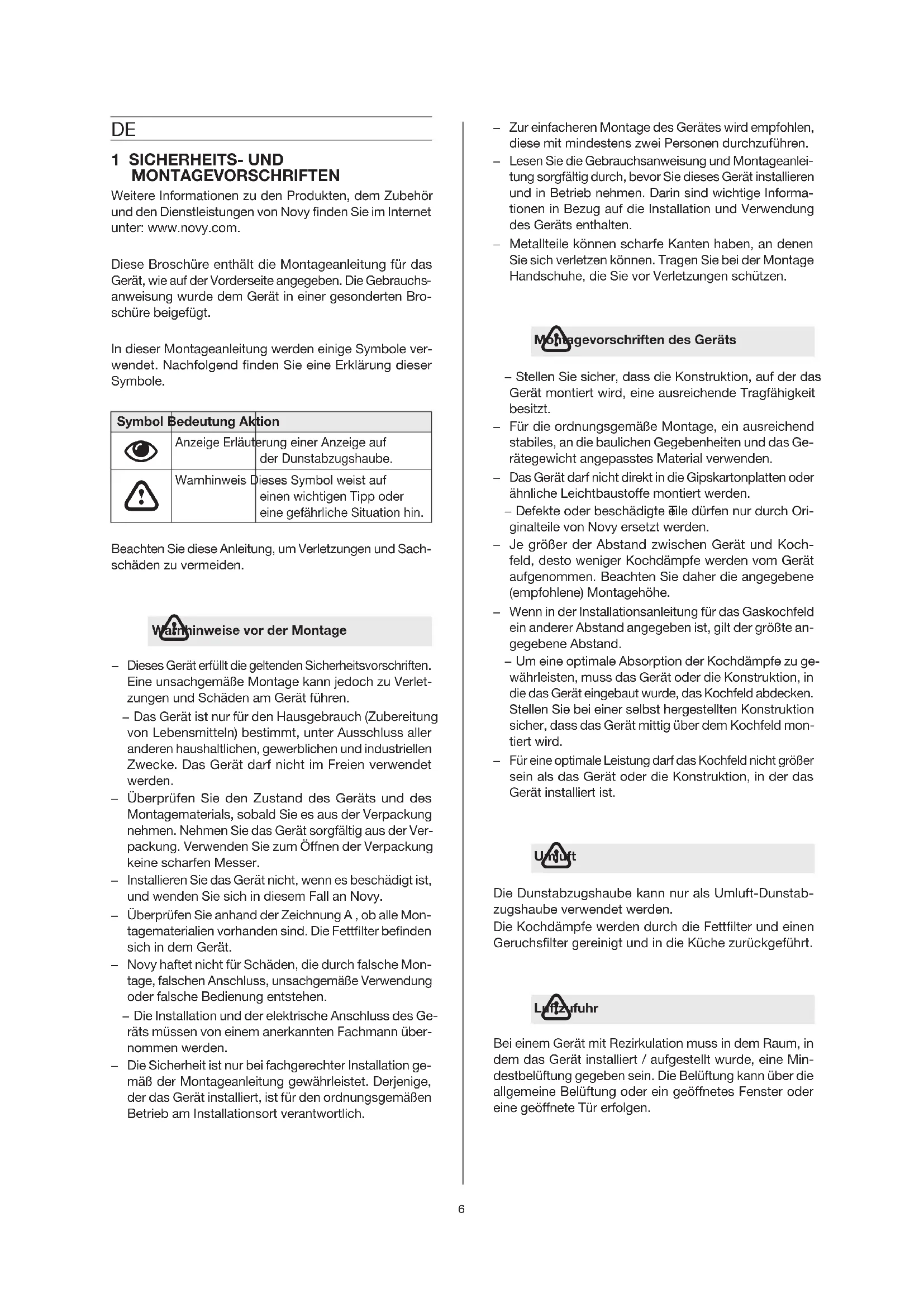 1 SICHERHEITS- UND MONTAGEVORSCHRIFTEN Weitere Informationen zu den Produkten, dem Zubehör und den Dienstleistungen von Novy nden Sie im Internet unter: www.novy.com. Diese Broschüre enthält die Montageanleitung für das Gerät, wie auf der Vorderseite angegeben. Die Gebrauchs