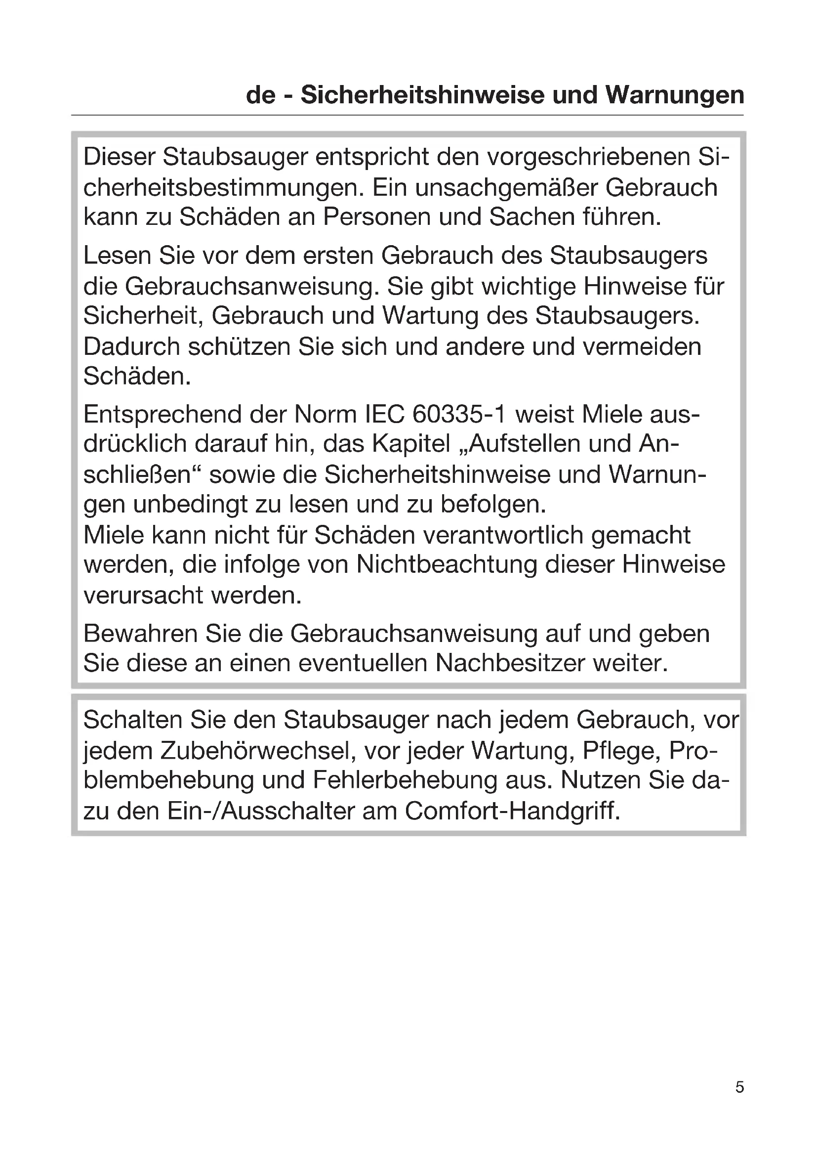 Dieser Staubsauger entspricht den vorgeschriebenen Si- cherheitsbestimmungen. Ein unsachgemäßer Gebrauch kann zu Schäden an Personen und Sachen führen. Lesen Sie vor dem ersten Gebrauch des Staubsaugers die Gebrauchsanweisung. Sie gibt wichtige Hinweise für Sicherheit, Gebrauch und Wartung des Staubsaugers. Dadurch schützen Sie sich und andere und vermeiden Schäden. Entsprechend der Norm IEC 60335-1 weist Miele aus- drücklich darauf hin, das Kapitel „Aufstellen und An- schließen“ sowie die Sicherheitshinweise und Warnun- gen unbedingt zu lesen und zu befolgen. Miele kann nicht für Schäden verantwortlich gemacht werden, die infolge von Nichtbeachtung dieser Hinweise verursacht werden. Bewahren Sie die Gebrauchsanweisung auf und geben Sie diese an einen eventuellen Nachbesitzer weiter. Schalten Sie den Staubsauger nach jedem Gebrauch, vor jedem Zubehörwechsel, vor jeder Wartung, Pflege, Pro- blembehebung und Fehlerbehebung aus. Nutzen Sie da- zu den Ein-/Ausschalter am Comfort-Handgriff.de - Sicherheitshinweise und Warnungen