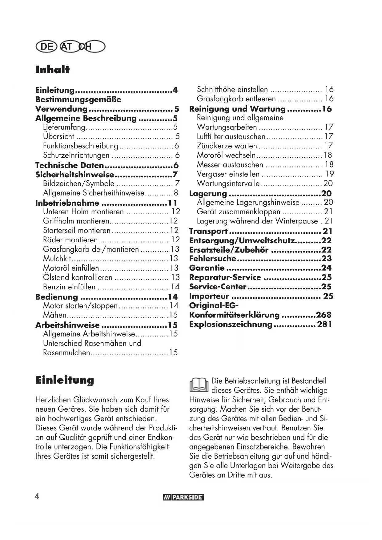 - Explosionszeichnung Einleitung Herzlichen Glückwunsch zum Kauf Ihres neuen Gerätes. Sie haben sich damit für ein hochwertiges Gerät entschieden. Dieses Gerät wurde während der Produkti- on auf Qualität geprüft und einer Endkon- trolle unterzogen. Die Funktionsfähigkeit Ihres Gerätes ist somit sichergestellt. Die Betriebsanleitung ist Bestandteil dieses Gerätes. Sie enthält wichtige Hinweise für Sicherheit, Gebrauch und Ent- sorgung. Machen Sie sich vor der Benut- zung des Gerätes mit allen Bedien- und Si- cherheitshinweisen vertraut. Benutzen Sie das Gerät nur wie beschrieben und für die angegebenen Einsatzbereiche. Bewahren Sie die Betriebsanleitung gut auf und händi- gen Sie alle Unterlagen bei Weitergabe des Gerätes an Dritte mit aus.5 CHATDE Bestimmungsgemäße Verwendung Das Gerät ist nur für das Mähen von Rasen- und Grasfl ächen im häuslichen Be- reich bestimmt. Dieses Gerät ist nicht zur gewerblichen Nutzung geeignet. Bei ge- werblichem Einsatz erlischt die Garantie. Jede andere Verwendung, die in dieser Betriebsanleitung nicht ausdrücklich zuge- lassen wird, kann zu Schäden am Gerät führen und eine ernsthafte Gefahr für den Benutzer darstellen. Das Gerät ist zum Gebrauch durch Erwach- sene bestimmt. Kinder sowie Personen, die mit dieser Betriebsanleitung nicht vertraut sind, dürfen das Gerät nicht benutzen. Der Bediener oder Nutzer ist für Unfälle oder Schäden an anderen Menschen oder deren Eigentum verantwortlich. Allgemeine Beschreibung Die Abbildung der wichtigsten Funktionsteile nden Sie auf der vorderen und hinteren Aus- klappseite. Lieferumfang Nehmen Sie das Gerät vorsichtig aus der Packung und prüfen Sie, ob die nachfol- genden Teile vollständig sind: - Benzin-Rasenmäher - 2x Unterer Holm - Montagezubehör für den Griffholm - Grasfangkorb - Kabelklemme - Zündkerzenschlüssel - Mulchkit - Schraubendreher - Kurzanleitung - Betriebsanleitung Der mitgelieferte Schraubendreher kann sowohl als Schlitz- als auch als Kreuzschlitz-Schraubendreher verwen- det werden. Sie können durch Umste- cken des Griffs die Schraubvariante wechseln. Übersicht 1 Griffholm 2 Sicherheitsbügel 3 Montagezubehör, Griffholm 4 Unterer Holm 5 Grasfangkorb 6 Prallschutz 7 Tankdeckel 8 Einfüllstutzen 9 Luft lterbox 10 Luft lter (nicht sichtbar) 11 Benzinpumpe (Primer) 12 Rasenmähergehäuse 13 Räder 14 Gerätegriff 15 Auspuffschutz 16 Zündkerzenstecker 17 Zündkerze (nicht sichtbar) 18 Motorabdeckung mit Lüftungsöff- nungen (Fingerschutz) 19 Bowdenzug 20 Kabelklemme 21 Starterseil-Führung 22 Startergriff mit Starterseil 23 Zündkerzenschlüssel 24 Mulchkit 25 Schraubendreher 4a Kreuzschlitzschraube 3a Griffmutter 3b Unterlegscheibe 3c Schraube 26 Aufhängung Grasfangkorb 5a Tragegriff6 DE AT CH 27 Öltankkappe mit Ölmessstab 28 Position Schnitthöhe 13a Radschraube 13b Sicherheitsscheibe 29 Messer 30 Messerschraube 31 Motorspindel 32 Spannscheibe 33 Ölablassschraube Funktionsbeschreibung Das Gerät wird mit einem leistungsfähigen 4-Takt-Motor (Zongshen 132cc Easy Start) angetrieben. Das Gerät ist mit einem robusten Kunststoff- gehäuse, einem Grasfangkorb und einem zusammenklappbaren Griffholm ausgestattet. Die Funktion der Bedienteile entnehmen Sie bitte den nachfolgenden Beschreibungen. Schutzeinrichtungen 2 Sicherheitsbügel Bei Loslassen des Sicherheitsbügels stoppt das Gerät. 15 Auspuffschutz verhindert, dass Hände oder brennbare Materialien mit einem heißen Auspuff in Kontakt kommen. 6 Prallschutz schützt die Bedienperson vor wegge- schleuderten Teilen und vor unbeab- sichtigter Messerberührung, wenn ohne Grasfangkorb gemäht wird. Technische Daten Benzin-Rasenmäher PBM 132 B1 Motor p. 281