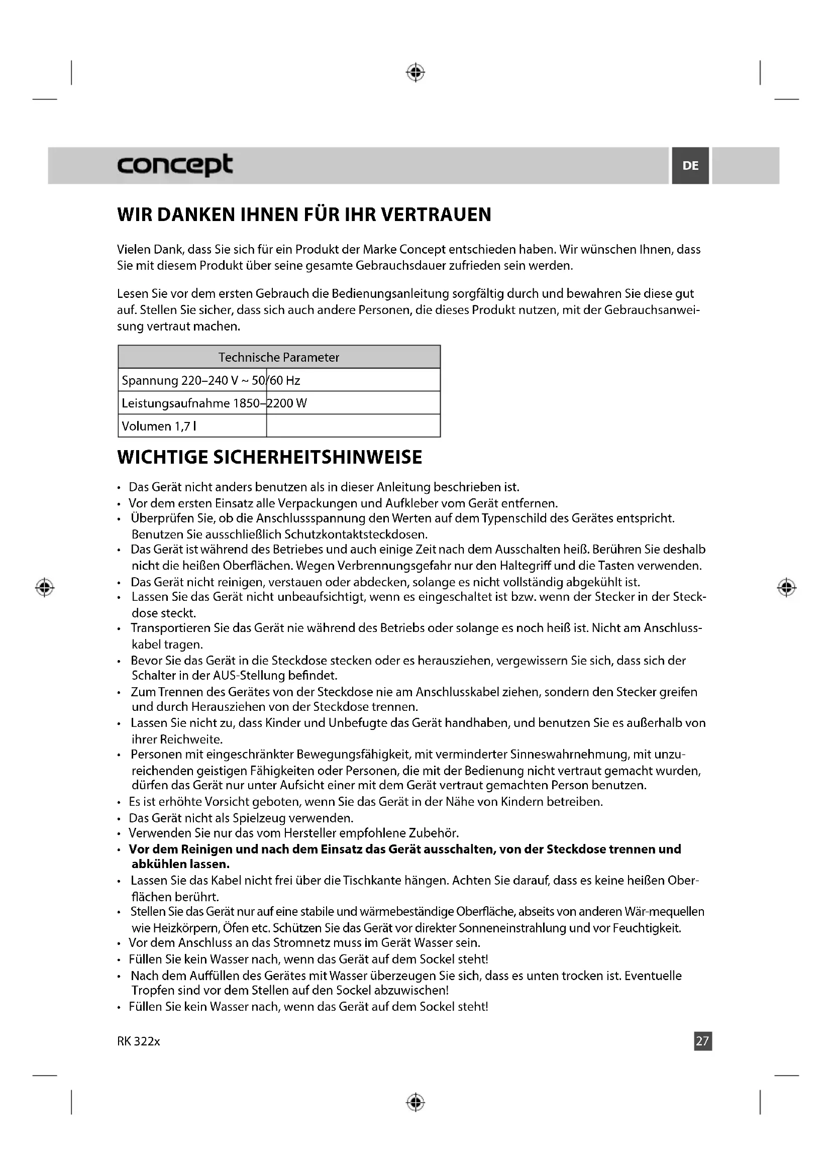 RK 322x27 WIR DANKEN IHNEN FÜR IHR VERTRAUEN Vielen Dank, dass Sie sich für ein Produkt der Marke Concept entschieden haben. Wir wünschen Ihnen, dass Sie mit diesem Produkt über seine gesamte Gebrauchsdauer zufrieden sein werden. Lesen Sie vor dem ersten Gebrauch die Bedienungsanleitung sorgfältig durch und bewahren Sie diese gut auf. Stellen Sie sicher, dass sich auch andere Personen, die dieses Produkt nutzen, mit der Gebrauchsanwei- sung vertraut machen. Technische Parameter Spannung 220–240 V ~ 50/60 Hz Leistungsaufnahme 1850–2200 W Volumen 1,7 l WICHTIGE SICHERHEITSHINWEISE