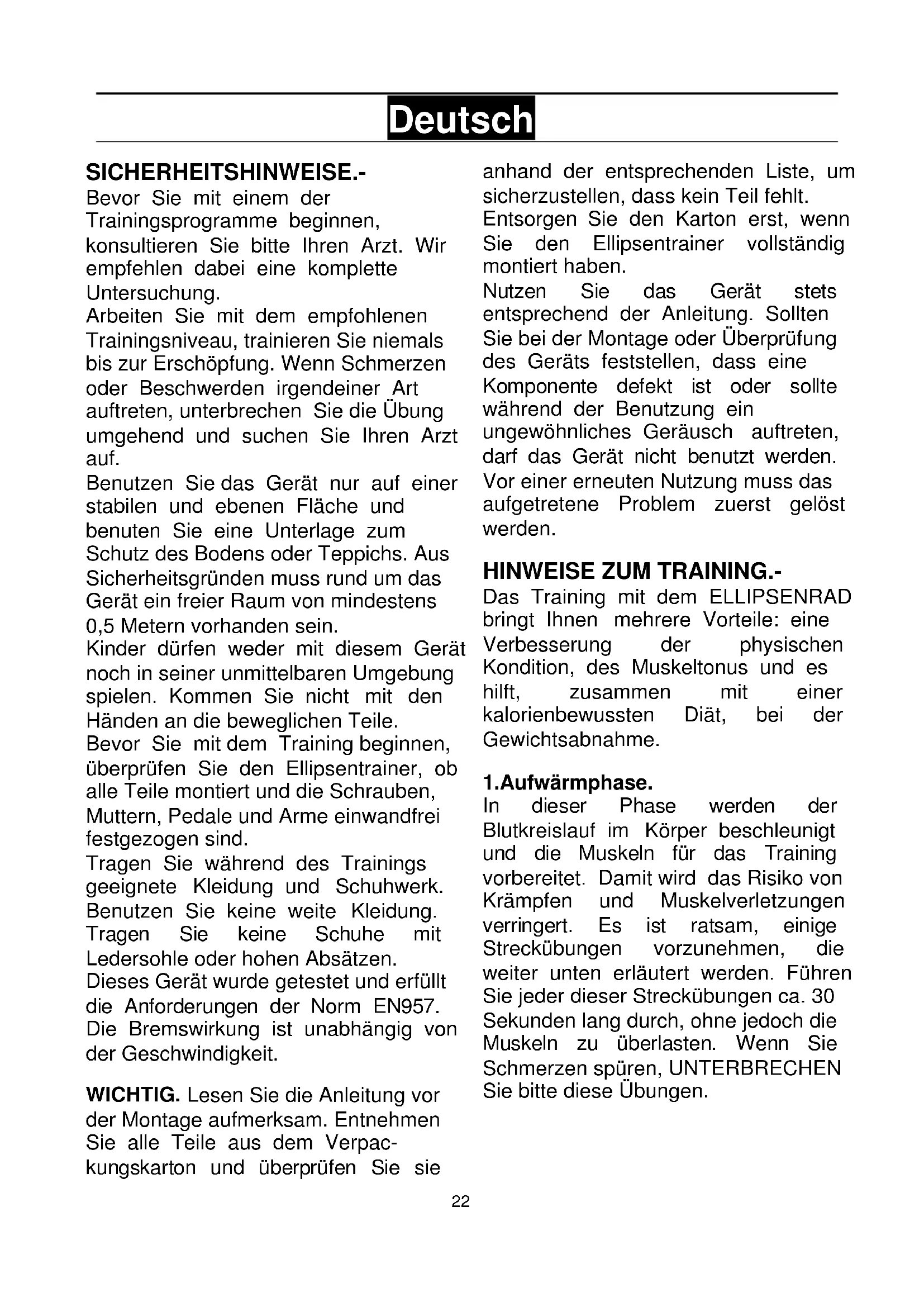 Deutsch SICHERHEITSHINWEISE.- Bevor Sie mit einem der Trainingsprogramme beginnen, konsultieren Sie bitte Ihren Arzt. Wir empfehlen dabei eine komplette Untersuchung. Arbeiten Sie mit dem empfohlenen Trainingsniveau, trainieren Sie niemals bis zur Erschöpfung. Wenn Schmerzen oder Beschwerden irgendeiner Art auftreten, unterbrechen Sie die Übung umgehend und suchen Sie Ihren Arzt auf. Benutzen Sie das Gerät nur auf einer stabilen und ebenen Fläche und benuten Sie eine Unterlage zum Schutz des Bodens oder Teppichs. Aus Sicherheitsgründen muss rund um das Gerät ein freier Raum von mindestens 0,5 Metern vorhanden sein. Kinder dürfen weder mit diesem Gerät noch in seiner unmittelbaren Umgebung spielen. Kommen Sie nicht mit den Händen an die beweglichen Teile. Bevor Sie mit dem Training beginnen, überprüfen Sie den Ellipsentrainer, ob alle Teile montiert und die Schrauben, Muttern, Pedale und Arme einwandfrei festgezogen sind. Tragen Sie während des Trainings geeignete Kleidung und Schuhwerk. Benutzen Sie keine weite Kleidung. Tragen Sie keine Schuhe mit Ledersohle oder hohen Absätzen. Dieses Gerät wurde getestet und erfüllt die Anforderungen der Norm EN957. Die Bremswirkung ist unabhängig von der Geschwindigkeit. WICHTIG. Lesen Sie die Anleitung vor der Montage aufmerksam. Entnehmen Sie alle Teile aus dem Verpac- kungskarton und überprüfen Sie sie anhand der entsprechenden Liste, um sicherzustellen, dass kein Teil fehlt. Entsorgen Sie den Karton erst, wenn Sie den Ellipsentrainer vollständig montiert haben. Nutzen Sie das Gerät stets entsprechend der Anleitung. Sollten Sie bei der Montage oder Überprüfung des Geräts feststellen, dass eine Komponente defekt ist oder sollte während der Benutzung ein ungewöhnliches Geräusch auftreten, darf das Gerät nicht benutzt werden. Vor einer erneuten Nutzung muss das aufgetretene Problem zuerst gelöst werden.