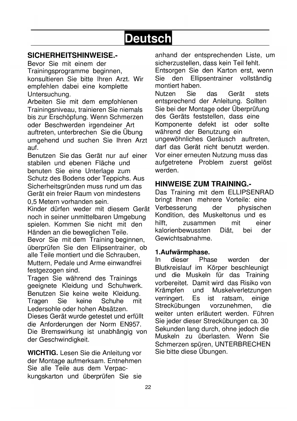 Deutsch SICHERHEITSHINWEISE.- Bevor Sie mit einem der Trainingsprogramme beginnen, konsultieren Sie bitte Ihren Arzt. Wir empfehlen dabei eine komplette Untersuchung. Arbeiten Sie mit dem empfohlenen Trainingsniveau, trainieren Sie niemals bis zur Erschöpfung. Wenn Schmerzen oder Beschwerden irgendeiner Art auftreten, unterbrechen Sie die Übung umgehend und suchen Sie Ihren Arzt auf. Benutzen Sie das Gerät nur auf einer stabilen und ebenen Fläche und benuten Sie eine Unterlage zum Schutz des Bodens oder Teppichs. Aus Sicherheitsgründen muss rund um das Gerät ein freier Raum von mindestens 0,5 Metern vorhanden sein. Kinder dürfen weder mit diesem Gerät noch in seiner unmittelbaren Umgebung spielen. Kommen Sie nicht mit den Händen an die beweglichen Teile. Bevor Sie mit dem Training beginnen, überprüfen Sie den Ellipsentrainer, ob alle Teile montiert und die Schrauben, Muttern, Pedale und Arme einwandfrei festgezogen sind. Tragen Sie während des Trainings geeignete Kleidung und Schuhwerk. Benutzen Sie keine weite Kleidung. Tragen Sie keine Schuhe mit Ledersohle oder hohen Absätzen. Dieses Gerät wurde getestet und erfüllt die Anforderungen der Norm EN957. Die Bremswirkung ist unabhängig von der Geschwindigkeit. WICHTIG. Lesen Sie die Anleitung vor der Montage aufmerksam. Entnehmen Sie alle Teile aus dem Verpac- kungskarton und überprüfen Sie sie anhand der entsprechenden Liste, um sicherzustellen, dass kein Teil fehlt. Entsorgen Sie den Karton erst, wenn Sie den Ellipsentrainer vollständig montiert haben. Nutzen Sie das Gerät stets entsprechend der Anleitung. Sollten Sie bei der Montage oder Überprüfung des Geräts feststellen, dass eine Komponente defekt ist oder sollte während der Benutzung ein ungewöhnliches Geräusch auftreten, darf das Gerät nicht benutzt werden. Vor einer erneuten Nutzung muss das aufgetretene Problem zuerst gelöst werden.