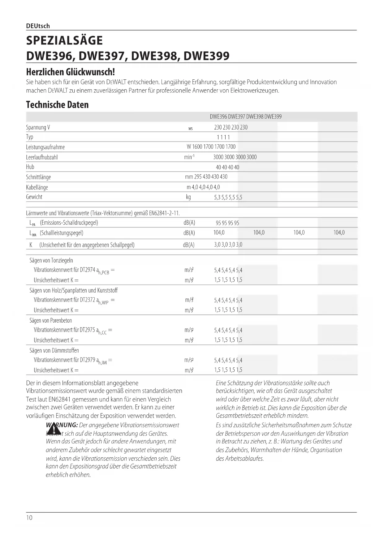 WARNUNG: Der angegebene Vibrationsemissionswert bezieht sich auf die Hauptanwendung des Gerätes. Wenn das Gerät jedoch für andere Anwendungen, mit anderem Zubehör oder schlecht gewartet eingesetzt wird, kann die Vibrationsemission verschieden sein. Dies kann den Expositionsgrad über die Gesamtbetriebszeit erheblicherhöhen. SPEZIALSÄGE