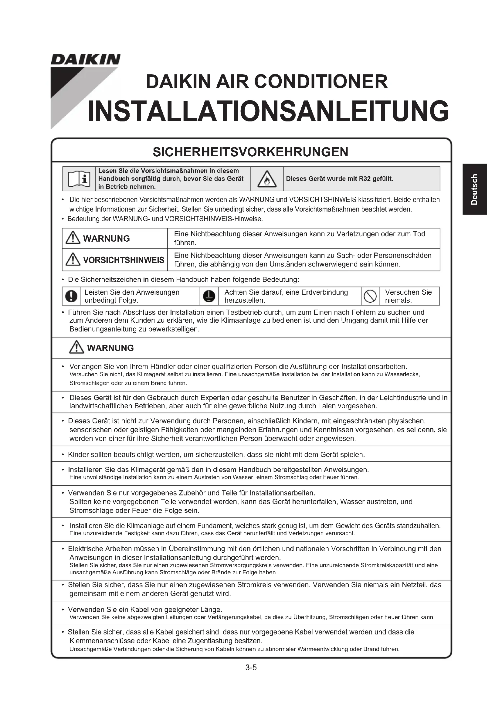VORSICHTSHINWEIS Eine Nichtbeachtung dieser Anweisungen kann zu Sach- oder Personenschäden führen, die abhängig von den Umständen schwerwiegend sein können.• Die Sicherheitszeichen in diesem Handbuch haben folgende Bedeutung:Leisten Sie den Anweisungen unbedingt Folge.Achten Sie darauf, eine Erdverbindung herzustellen.Versuchen Sie niemals.• Führen Sie nach Abschluss der Installation einen Testbetrieb durch, um zum Einen nach Fehlern zu suchen und zum Anderen dem Kunden zu erklären, wie die Klimaanlage zu bedienen ist und den Umgang damit mit Hilfe der Bedienungsanleitung zu bewerkstelligen. WARNUNG