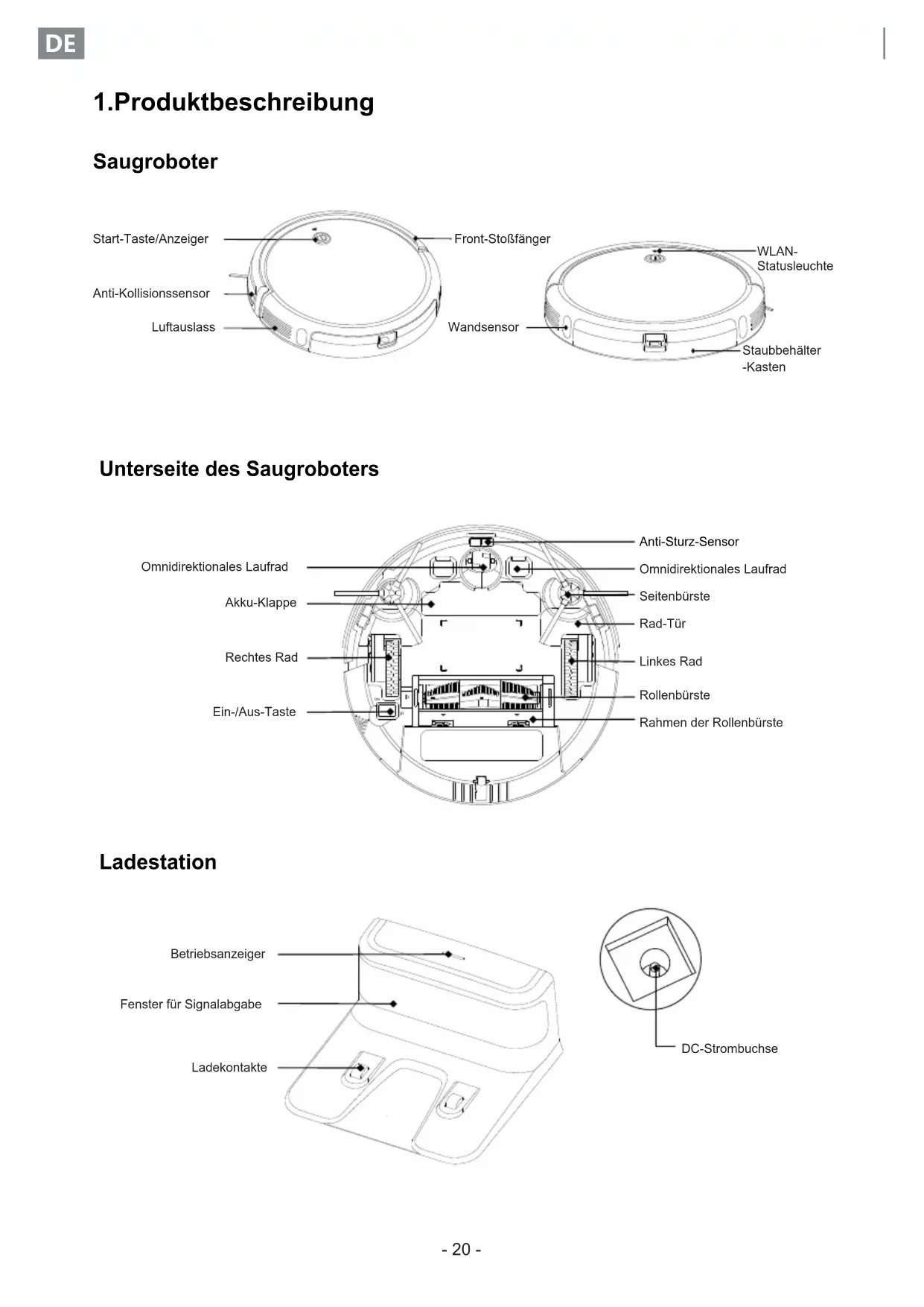 Unterseite des Saugroboters Ladestation BetriebsanzeigerFenster für SignalabgabeLadekontakteDC-Strombuchse 1.Produktbeschreibung Saugroboter