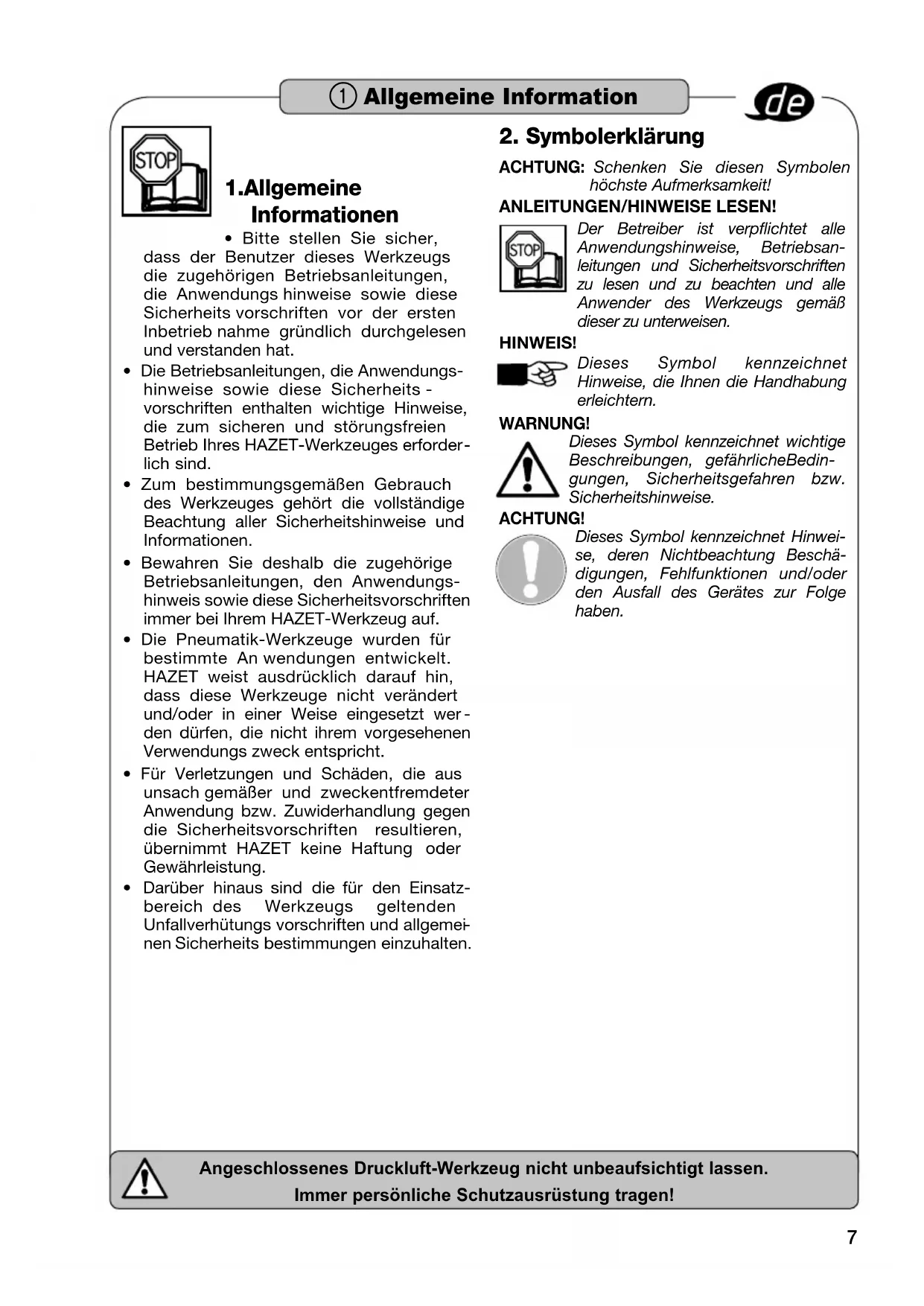 - Der unsachgemäße Gebrauch des HAZET- Pneumatik-Werkzeuges oder der Gebrauch nicht entsprechend den Sicherheitsvor- schriften kann zu schweren Verletzungen oder zum Tode führen.