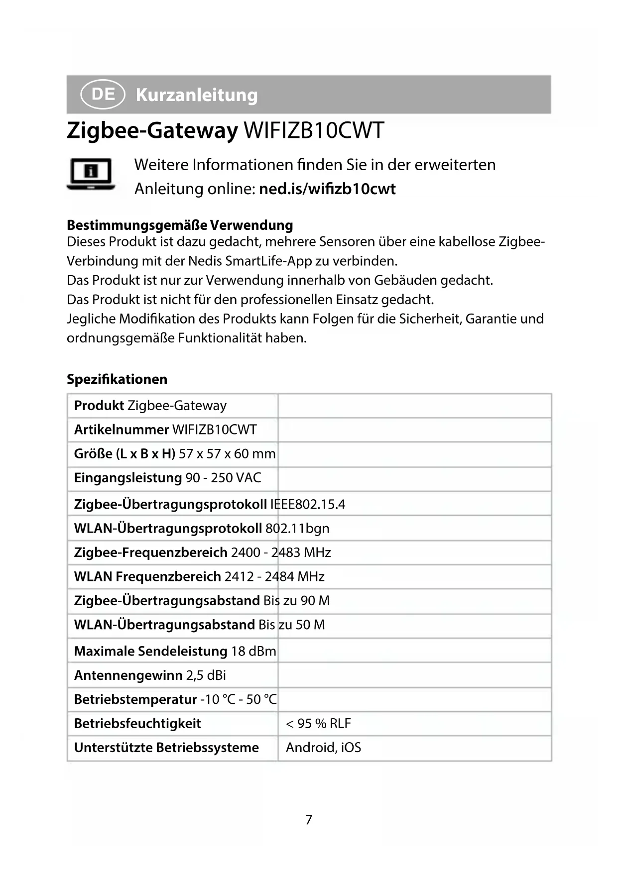 Kurzanleitung Zigbee-Gateway WIFIZB10CWT Weitere Informationen nden Sie in der erweiterten Anleitung online: ned.is/wizb10cwt Bestimmungsgemäße Verwendung Dieses Produkt ist dazu gedacht, mehrere Sensoren über eine kabellose Zigbee- Verbindung mit der Nedis SmartLife-App zu verbinden. Das Produkt ist nur zur Verwendung innerhalb von Gebäuden gedacht. Das Produkt ist nicht für den professionellen Einsatz gedacht. Jegliche Modikation des Produkts kann Folgen für die Sicherheit, Garantie und ordnungsgemäße Funktionalität haben. Spezikationen Produkt Zigbee-Gateway Artikelnummer WIFIZB10CWT Größe (L x B x H) 57 x 57 x 60 mm Eingangsleistung 90 - 250 VAC Zigbee-Übertragungsprotokoll IEEE802.15.4 WLAN-Übertragungsprotokoll 802.11bgn Zigbee-Frequenzbereich 2400 - 2483 MHz WLAN Frequenzbereich 2412 - 2484 MHz Zigbee-Übertragungsabstand Bis zu 90 M WLAN-Übertragungsabstand Bis zu 50 M Maximale Sendeleistung 18 dBm Antennengewinn 2,5 dBi Betriebstemperatur -10 °C - 50 °C Betriebsfeuchtigkeit < 95 % RLF Unterstützte Betriebssysteme Android, iOS8 Hauptbestandteile (Abbildung A)