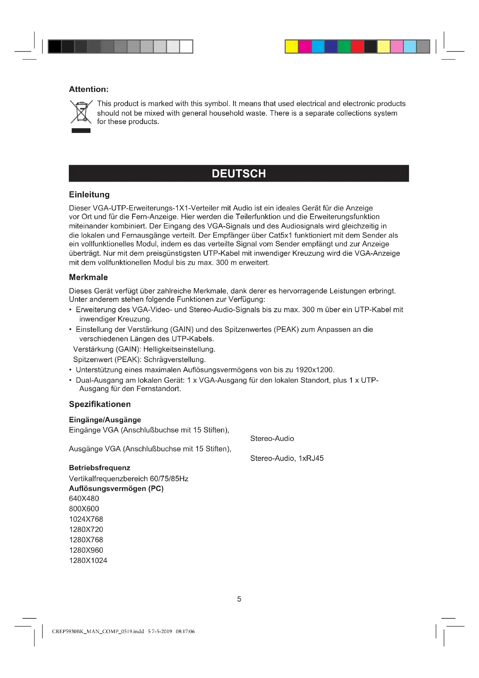 CAUTION CREP5930BK_MAN_COMP_0519.indd 4 7-5-2019 08:17:065 Attention: This product is marked with this symbol. It means that used electrical and electronic products should not be mixed with general household waste. There is a separate collections system for these products. DEUTSCH Einleitung Dieser VGA-UTP-Erweiterungs-1X1-Verteiler mit Audio ist ein ideales Gerät für die Anzeige vor Ort und für die Fern-Anzeige. Hier werden die Teilerfunktion und die Erweiterungsfunktion miteinander kombiniert. Der Eingang des VGA-Signals und des Audiosignals wird gleichzeitig in die lokalen und Fernausgänge verteilt. Der Empfänger über Cat5x1 funktioniert mit dem Sender als ein vollfunktionelles Modul, indem es das verteilte Signal vom Sender empfängt und zur Anzeige überträgt. Nur mit dem preisgünstigsten UTP-Kabel mit inwendiger Kreuzung wird die VGA-Anzeige mit dem vollfunktionellen Modul bis zu max. 300 m erweitert. Merkmale Dieses Gerät verfügt über zahlreiche Merkmale, dank derer es hervorragende Leistungen erbringt. Unter anderem stehen folgende Funktionen zur Verfügung: