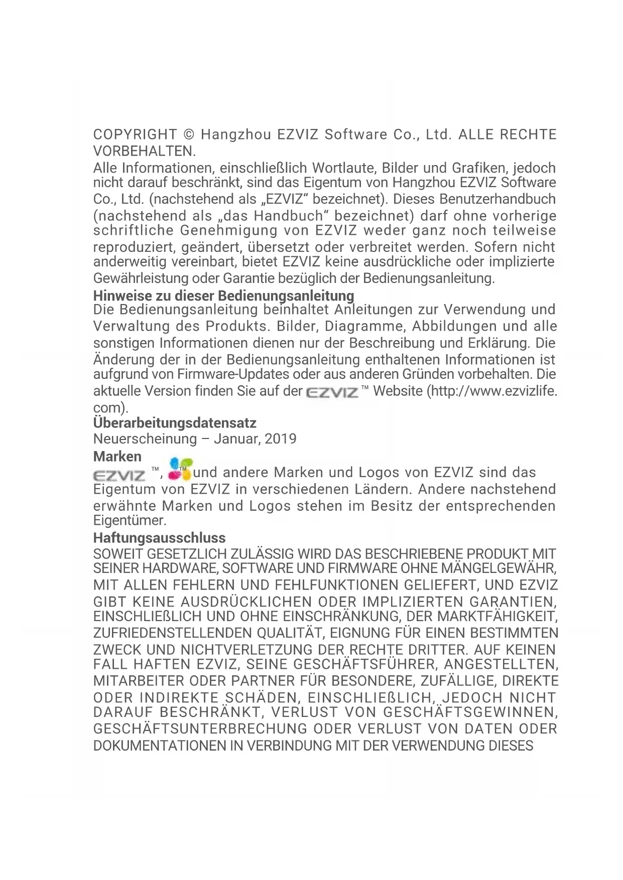 - Routine cleaning, normal cosmetic and mechanical wear and tear. Please do not hesitate to contact your seller or our Customer Service, with any questions.EINGESCHRÄNKTE GARANTIE Vielen Dank, dass Sie sich für Produkte der Hangzhou EZVIZ Software Co., Ltd. (EZVIZ) entschieden haben. Diese eingeschränkte Garantie („Garantie“) gibt Ihnen, dem Erstkäufer des EZVIZ-Produkts, spezifische Rechtsansprüche. Sie können auch andere gesetzliche Rechte haben, die je nach Staat, Provinz oder Gerichtsbarkeit variieren. Diese Garantie gilt nur für den Erstkäufer des Produkts. „Erstkäufer“ ist jeder Verbraucher, der das EZVIZ-Produkt bei einem autorisierten Verkäufer gekauft hat. Die Haftungsausschlüsse, Ausschlüsse und Beschränkungen der Haftung im Rahmen dieser Garantie gelten nicht, soweit sie durch geltendes Recht verboten sind. Kein Vertriebspartner, Wiederverkäufer, Vertreter oder Mitarbeiter ist berechtigt, Änderungen, Erweiterungen oder Ergänzungen dieser Garantie vorzunehmen. Für Ihr EZVIZ-Produkt gilt eine Garantie von zwei (2) Jahren ab Kaufdatum gegen Material- und Verarbeitungsfehler oder eine längere Zeitspanne, die das Gesetz des Landes oder Bundesstaates, in dem dieses Produkt verkauft wird, vorschreibt, wenn es normalerweise gemäß der Bedienungsanleitung verwendet wird. Sie können Garantieleistungen anfordern, indem Sie sich an unseren Kundendienst wenden. Für defekte EZVIZ-Produkte im Rahmen der Garantie wird EZVIZ nach eigenem Ermessen (i) Ihr Produkt kostenlos reparieren oder ersetzen, (ii) Ihr Produkt gegen ein funktional gleichwertiges Produkt austauschen, oder (iii) den ursprünglichen Kaufpreis zurückerstatten, vorausgesetzt, Sie legen die Original-Kaufquittung oder deren Kopie, eine kurze Erklärung des Defekts und das Produkt in der Originalverpackung vor. Nach eigenem Ermessen kann EZVIZ eine Reparatur oder einen Austausch mit einem neuen oder überholten Produkt oder Komponenten durchführen. Diese Garantie deckt nicht die Versandkosten, die Versicherung oder andere Nebenkosten, die Ihnen bei der Rücksendung des Produkts entstehen. Sofern nicht durch geltendes Recht verboten, ist dies Ihr einziges und ausschließliches Rechtsmittel bei Verletzung dieser Garantie. Jedes Produkt, das im Rahmen dieser Garantie repariert oder ersetzt wurde, unterliegt den Bedingungen dieser Garantie für die Dauer von neunzig (90) Tagen ab Lieferdatum oder der verbleibenden ursprünglichen Garantiezeit. Diese Garantie gilt nicht und ist unter folgenden Bedingungen ungültig: