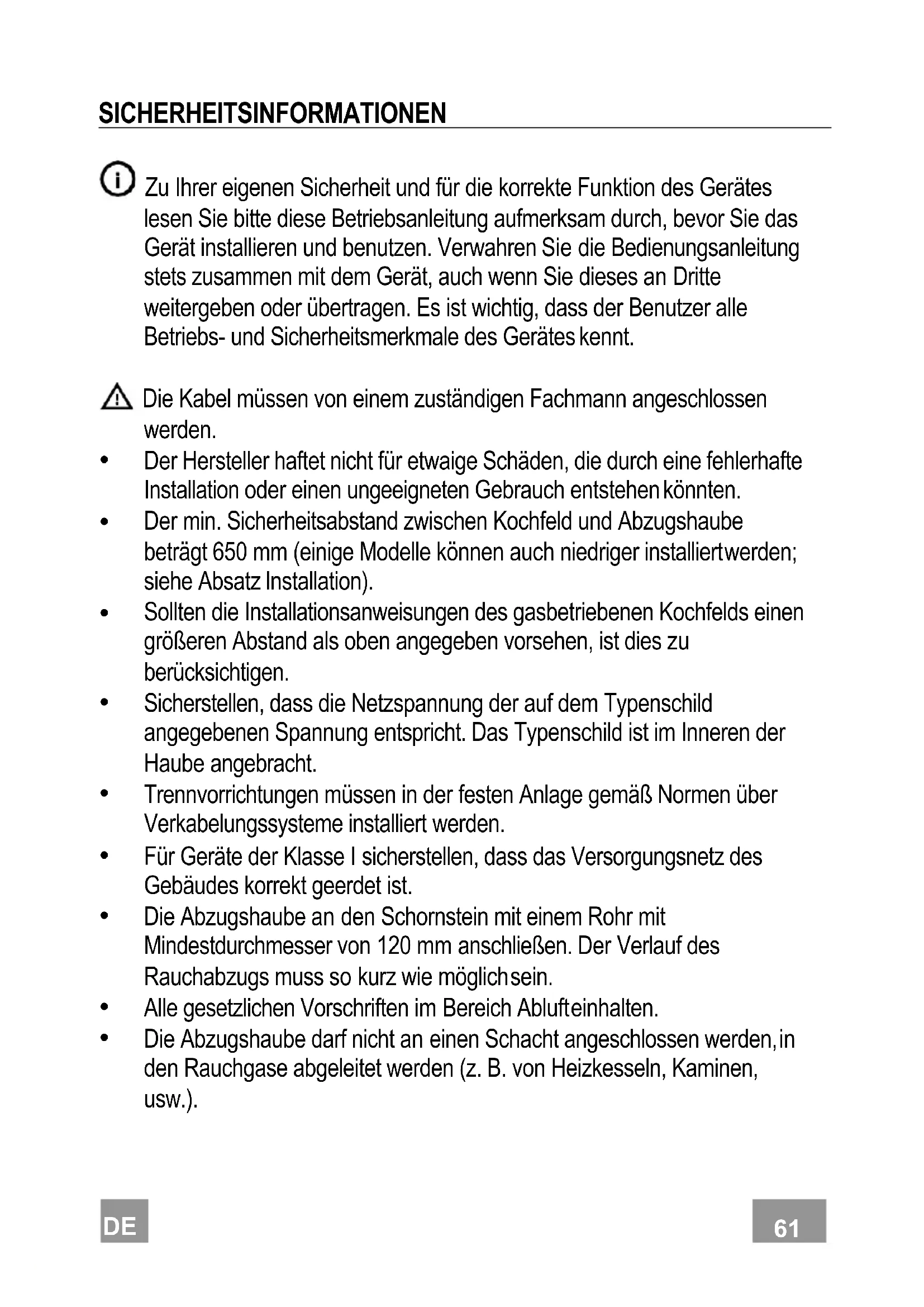 - Bei Anschluss der Haube an das Stromnetz muss ein zweipoliger Schalter mit einem Öffnungsweg von mindestens 3 mm Zwischengeschaltet werden.
