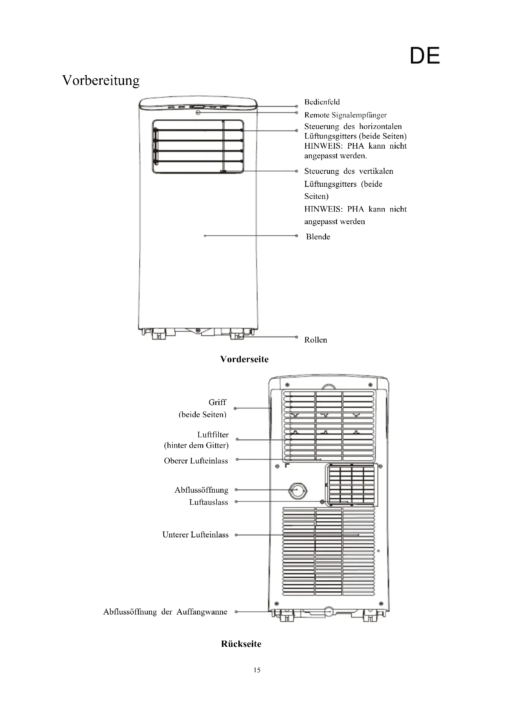 Vielen Dank für den Kauf unseres tragbaren Klimagerätes Lesen Sie bitte diese Bedienungsanleitung vor der Verwendung Ihres Klimagerät sorgfältig durch und bewahren Sie sie zum späteren Nachschlagen auf. DIESE ANLEITUNG LESEN UND AUFBEWAHREN!! DE1 Inhalte Sicherheitshinweise ·········································································· 2 Vorsichtsmaßnahmen ········································································ 4 Warnungen (nur für die Kühlmittel R290/R32) ·········································· 6 Vorbereitungen ················································································ 15 Installation ····················································································· 17 Verwendung ··················································································· 21 Pflege ··························································································· 28 Fehlerdiagnose ················································································ 29 Hinweise zum Design und der Kompatibilität ············································ 30 Soziale Bemerkungen ········································································ 31 DE15 Vorbereitung Vorderseite Rückseite Bedienfeld Remote Signalempfänger Steuerung des horizontalen Lüftungsgitters (beide Seiten) HINWEIS: PHA kann nicht angepasst werden. Steuerung des vertikalen Lüftungsgitters (beide Seiten) HINWEIS: PHA kann nicht angepasst werden Blende Rollen Griff (beide Seiten) Luftfilter (hinter dem Gitter) Oberer Lufteinlass Abflussöffnung Luftauslass Unterer Lufteinlass Abflussöffnung der Auffangwanne DE16 Vorbereitung HINWEIS: Das Gerät, das Sie gekauft haben, könnte aussehen, wie eines der folgenden: