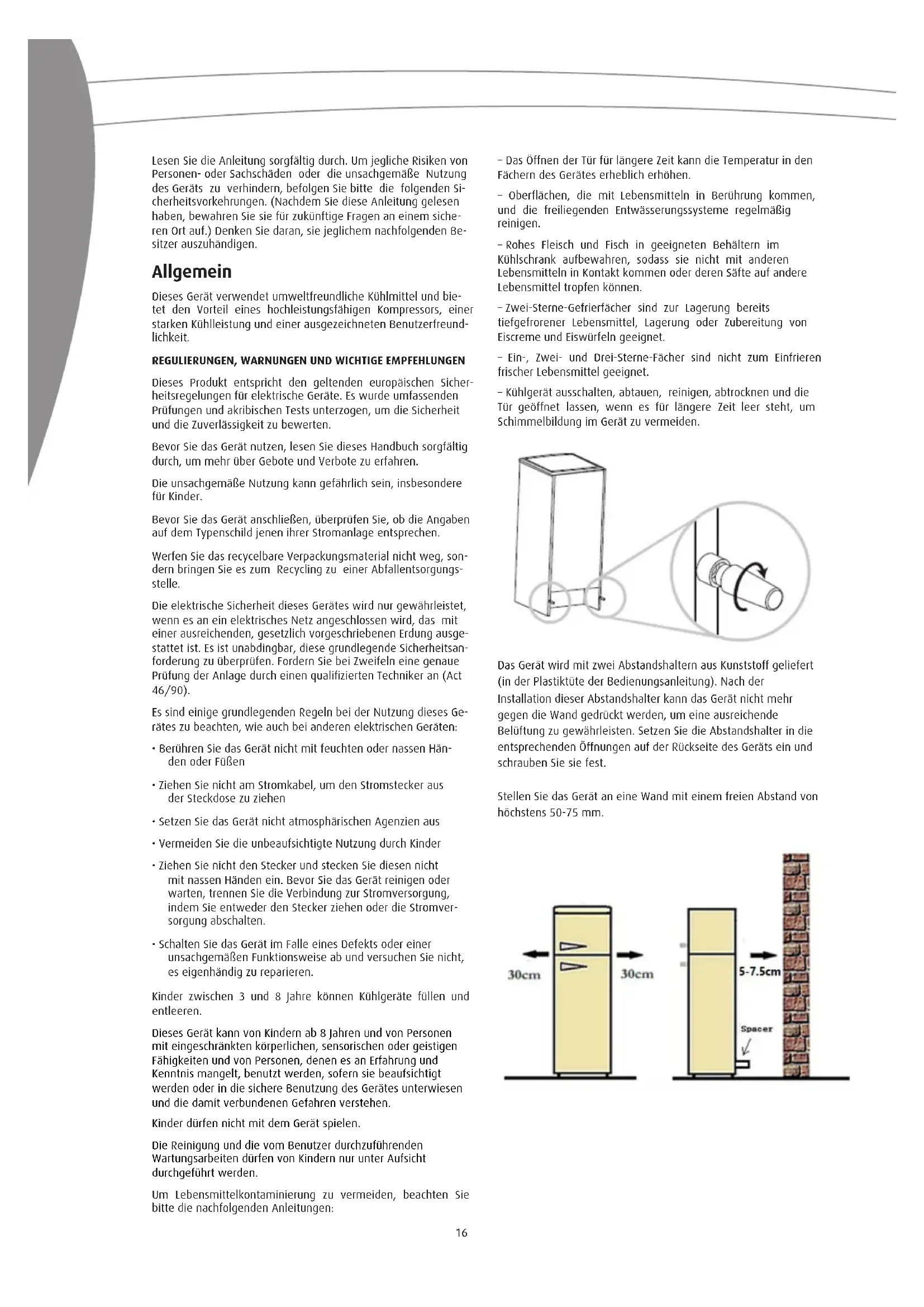 - Schalten Sie das Gerät im Falle eines Defekts oder einer unsachgemäßen Funktionsweise ab und versuchen Sie nicht, es eigenhändig zu reparieren. – Das Öffnen der Tür für längere Zeit kann die Temperatur in den Fächern des Gerätes erheblich erhöhen. – Oberflächen, die mit Lebensmitteln in Berührung kommen, und die freiliegenden Entwässerungssysteme regelmäßig reinigen. – Rohes Fleisch und Fisch in geeigneten Behältern im Kühlschrank aufbewahren, sodass sie nicht mit anderen Lebensmitteln in Kontakt kommen oder deren Säfte auf andere Lebensmittel tropfen können. – Zwei-Sterne-Gefrierfächer sind zur Lagerung bereits tiefgefrorener Lebensmittel, Lagerung oder Zubereitung von Eiscreme und Eiswürfeln geeignet. – Ein-, Zwei- und Drei-Sterne-Fächer sind nicht zum Einfrieren frischer Lebensmittel geeignet. – Kühlgerät ausschalten, abtauen, reinigen, abtrocknen und die Tür geöffnet lassen, wenn es für längere Zeit leer steht, um Schimmelbildung im Gerät zu vermeiden. Kinder zwischen 3 und 8 Jahre können Kühlgeräte füllen und entleeren. Dieses Gerät kann von Kindern ab 8 Jahren und von Personen mit eingeschränkten körperlichen, sensorischen oder geistigen Fähigkeiten und von Personen, denen es an Erfahrung und Kenntnis mangelt, benutzt werden, sofern sie beaufsichtigt werden oder in die sichere Benutzung des Gerätes unterwiesen und die damit verbundenen Gefahren verstehen. Kinder dürfen nicht mit dem Gerät spielen. Die Reinigung und die vom Benutzer durchzuführenden Wartungsarbeiten dürfen von Kindern nur unter Aufsicht durchgeführt werden. Um Lebensmittelkontaminierung zu vermeiden, beachten Sie bitte die nachfolgenden Anleitungen: Das Gerät wird mit zwei Abstandshaltern aus Kunststoff geliefert (in der Plastiktüte der Bedienungsanleitung). Nach der Installation dieser Abstandshalter kann das Gerät nicht mehr gegen die Wand gedrückt werden, um eine ausreichende Belüftung zu gewährleisten. Setzen Sie die Abstandshalter in die entsprechenden Öffnungen auf der Rückseite des Geräts ein und schrauben Sie sie fest. Stellen Sie das Gerät an eine Wand mit einem freien Abstand von höchstens 50-75 mm.17 Charakteristiken Die wesentlichen Charakteristiken des Kühlschranks sind: - Automatische Enteisung. Das Enteisungswasser ießt in eine Auffangvorrichtung, die sich auf dem Kompressor bendet, von wo aus es aufgrund der Hitzegenerierung während des Kühlprozesses verdampft. Warnung Wenn Sie Ihren Kühlschrank aufstellen, sollten Sie die klimatische Nennkapazität des Gerätes bedenken. Die klimatische Nennka- pazität Ihres Gerätes nden Sie auf dem Gerätekennzeichnungs- schild. Das Gerät funktioniert ordnungsgemäß innerhalb des in der Tabelle angegebenen Zimmertemperaturbereichs, gemäß seiner klimatischen Nennkapazität Klima klasse Klima klasse Zimmer temperatur N +16°C bis +32°C N-ST +16°C bis +38°C N-T +16°C bis +43°C SN +10°C bis +32°C SN-ST +10°C bis +38°C SN-T +10°C bis +43°C ST +18°C bis +38°C T +18°C bis +43°C ELEKTRISCHER ANSCHLUSS Prüfen Sie, ob die Hauptspannung der auf dem Typenschild in der unteren linken Seite des Kühlschrankfachs angegebenen Spannung entspricht. Wenn die Steckdose nicht über eine Erdung verfügt, oder wenn der Stecker nicht in die Steckdose passt, soll- ten Sie einen qualizierten Elektriker hinzuziehen. Benutzen Sie keine Mehrfachstecker oder -adapter, da dies zu Überhitzung und Feuer führen kann. Warnung: Dieses Gerät muss geerdet sein. Wenn das Gerät nicht mit einem Stecker versehen ist, muss der Anschluss an die Stromversorgung über einen Schalter erfolgen, der direkt mit den Stromanschlüssen verbunden ist. Dieser Schal- ter muss eine einpolige Unterbrechung des Gerätes mit einem Kontaktabstand von mindestens 3 mm gewährleisten. WARTUNG Es wird empfohlen, den Kühlschrank regelmäßig zu reinigen: A die Außenseite, mit einem Tuch und einer lauwarmen Lösung aus Wasser und Flüssigseife, und anschließend mit klarem Wasser abspülen; B im Inneren; trennen Sie das Gerät von der Stromversorgung und warten Sie, bis es komplett enteist ist. Wischen Sie Gitter, Regale und Auskleidung mit einem Tuch und einer lauwarmen Wasser-Natron-Lösung ab. Mit klarem Wasser ausspülen und abtrocknen. Verwenden Sie niemals aggres- sive Lösemittel und achten Sie darauf, dass das Wasser nicht in das Thermostatgehäuse eindringt. Bedienungsanleitung Kennzeichnung des Gerätes. Sie nden im Inneren des Kühlschranks, in der Nähe des Obst- und Gemüsefachs, ein Typenschild.18 Die Glühbirne im Inneren des Kühlschranks bendet sich im hinteren Bereich des Thermostatgehäuses. Sie sollten den Kühl- schrank bei längerer Abwesenheit abschalten und die Tür offen lassen, um die Bildung von Schimmel und unangenehmen Gerü- chen zu vermeiden. KUNDENDIENST Bevor Sie Ihren lokalen, zugelassenen Handelsvertreter anrufen, wenn der Kühlschrank nicht funktioniert, prüfen Sie, ob der Stek- ker richtig in der Steckdose steckt und ob das Thermostat auf “0” gestellt ist. Sollte der Kühlschrank ungewöhnlich laut sei, so vergewissern Sie sich, dass dieser eben aufgestellt ist und dass keine äußeren Objekte die Rückseite des Gerätes berühren. Soll- te der Kühlschrank nicht ausreichend Kälte generieren, so prüfen Sie, ob dieser überlastet ist, ob die Tür richtig schließt und ob der Kondensator verstaubt ist. Sollten Sie eine übermäßige Menge an Wasser im unteren Bereich des Kühlschranks (Gemüsefach und abnehmbare Ablage) feststellen, so prüfen Sie, ob der Ab- uss für das Enteisungswasser verstopft ist. Der Käufer ist verantwortlich für Schäden durch eine falsche Auf- stellung. Es wird keine Haftung übernommen, wenn das Gerät nicht gemäß nationalen und geltenden Standards geerdet wurde. Am Ende ihrer Lebenszeit sind Geräte, die Kühlgas R600a (Iso- butan) und brennbares Gas im Inneren des Isolierschaums ver- wenden, sicher aufzustellen, bevor sie an die Abfallentsorgung gesendet we