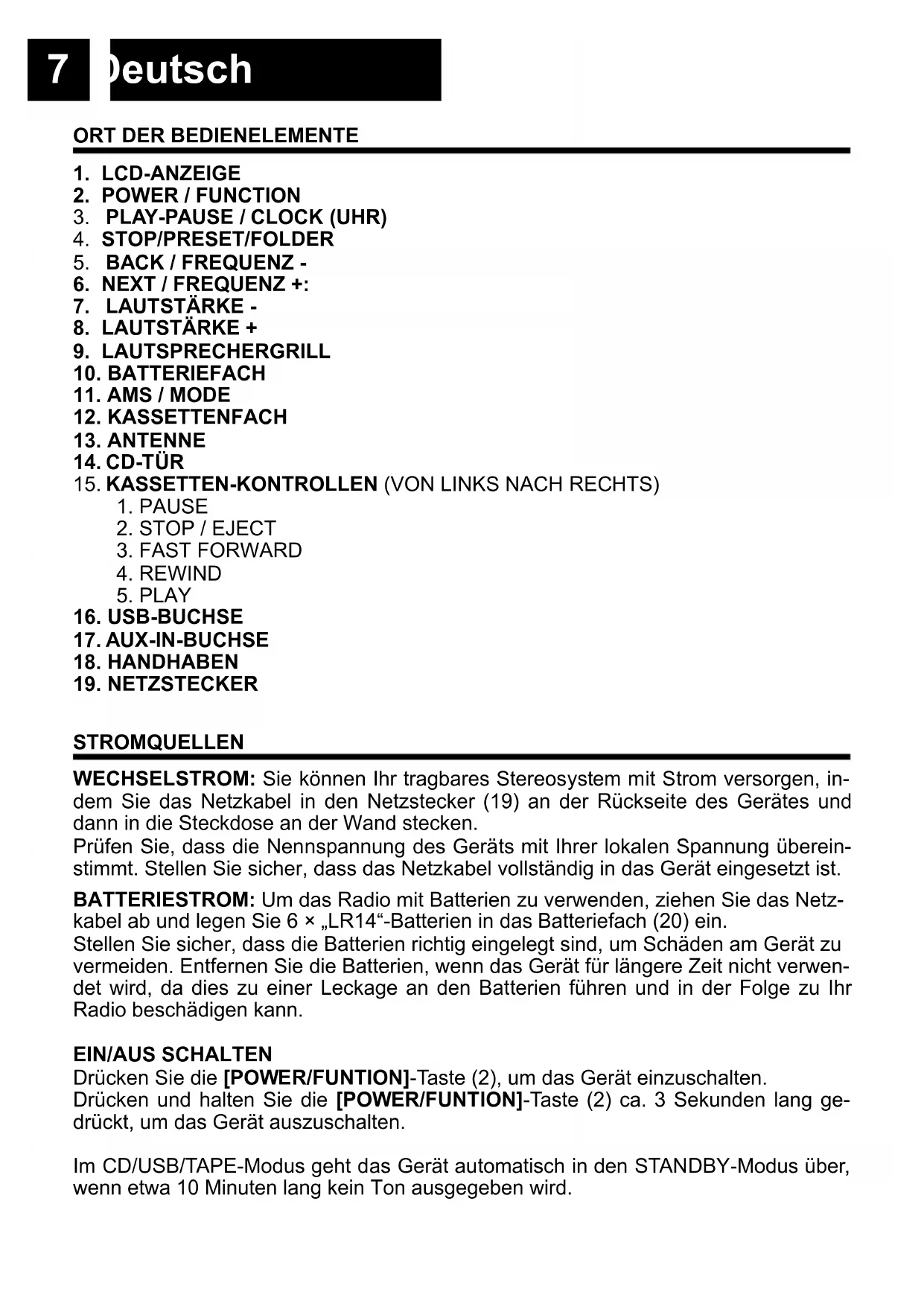 STROMQUELLEN WECHSELSTROM: Sie können Ihr tragbares Stereosystem mit Strom versorgen, in- dem Sie das Netzkabel in den Netzstecker (19) an der Rückseite des Gerätes und dann in die Steckdose an der Wand stecken. Prüfen Sie, dass die Nennspannung des Geräts mit Ihrer lokalen Spannung überein- stimmt. Stellen Sie sicher, dass das Netzkabel vollständig in das Gerät eingesetzt ist. BATTERIESTROM: Um das Radio mit Batterien zu verwenden, ziehen Sie das Netz- kabel ab und legen Sie 6 × „LR14“-Batterien in das Batteriefach (20) ein. Stellen Sie sicher, dass die Batterien richtig eingelegt sind, um Schäden am Gerät zu vermeiden. Entfernen Sie die Batterien, wenn das Gerät für längere Zeit nicht verwen- det wird, da dies zu einer Leckage an den Batterien führen und in der Folge zu Ihr Radio beschädigen kann.