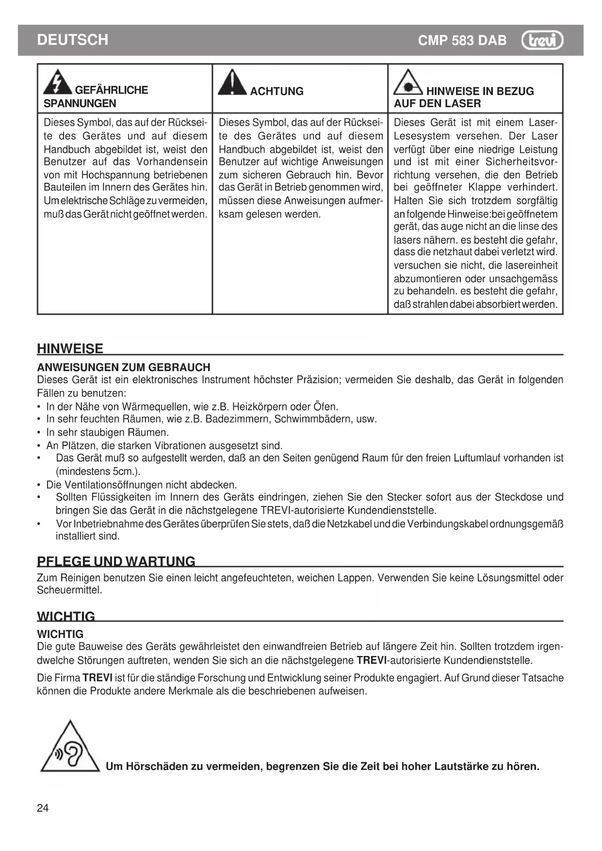 Dieses Symbol, das auf der Rücksei- te des Gerätes und auf diesem Handbuch abgebildet ist, weist den Benutzer auf das Vorhandensein von mit Hochspannung betriebenen Bauteilen im Innern des Gerätes hin. Um elektrische Schläge zu vermeiden, muß das Gerät nicht geöffnet werden. Dieses Symbol, das auf der Rücksei- te des Gerätes und auf diesem Handbuch abgebildet ist, weist den Benutzer auf wichtige Anweisungen zum sicheren Gebrauch hin. Bevor das Gerät in Betrieb genommen wird, müssen diese Anweisungen aufmer- ksam gelesen werden. Dieses Gerät ist mit einem Laser- Lesesystem versehen. Der Laser verfügt über eine niedrige Leistung und ist mit einer Sicherheitsvor- richtung versehen, die den Betrieb bei geöffneter Klappe verhindert. Halten Sie sich trotzdem sorgfältig an folgende Hinweise:bei geöffnetem gerät, das auge nicht an die linse des lasers nähern. es besteht die gefahr, dass die netzhaut dabei verletzt wird. versuchen sie nicht, die lasereinheit abzumontieren oder unsachgemäss zu behandeln. es besteht die gefahr, daß strahlen dabei absorbiert werden. DEUTSCH25 CMP 583 DAB
