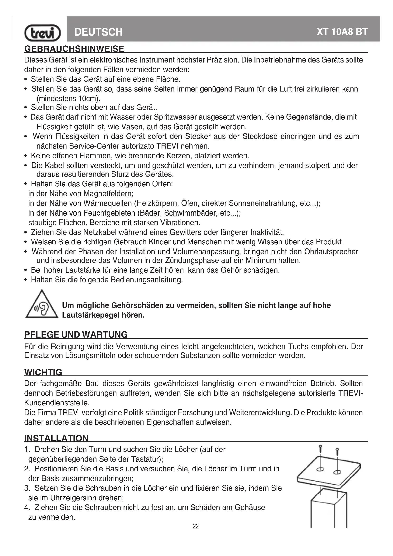 ACHTUNG ACHTUNG: DAS GERÄT NICHT ÖFFNEN. IM INNERN BEFINDEN SICH KEINE VOM BENUTZER SELBST INSTANDSETZBAREN TEILE UND AUCH KEINE ERSATZTEILE. FÜR JEGLICHE SERVICEARBEITEN, WENDEN SIE SICH BITTE AN EINE TREVI AUTORISIERTEN KUNDENDIENSTSTELLE. GEFAHR ELEKTRISCHER