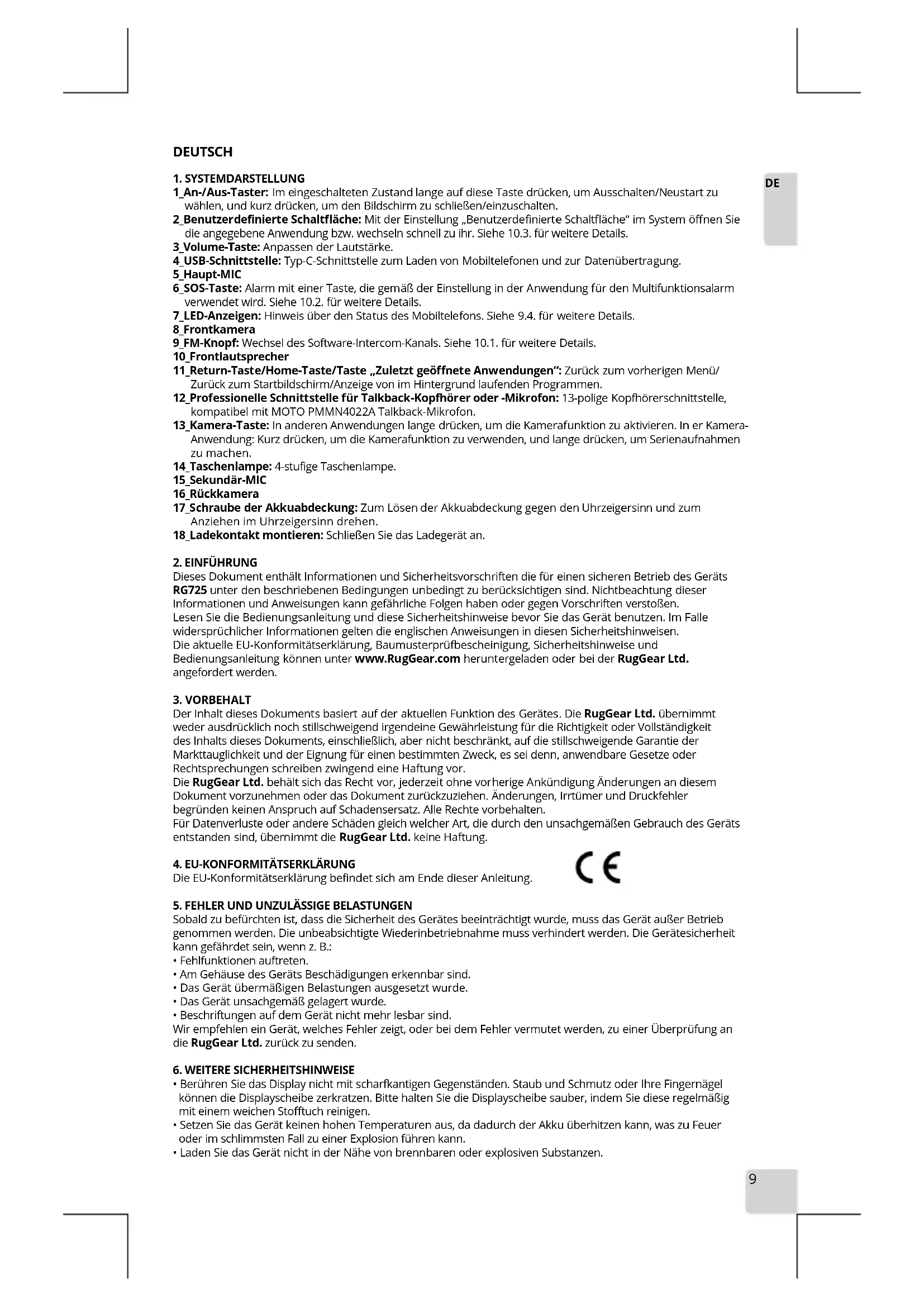 Dieses Dokument enthält Informationen und Sicherheitsvorschriften die für einen sicheren Betrieb des Geräts RG725 unter den beschriebenen Bedingungen unbedingt zu berücksichtigen sind. Nichtbeachtung dieser Informationen und Anweisungen kann gefährliche Folgen haben oder gegen Vorschriften verstoßen. Lesen Sie die Bedienungsanleitung und diese Sicherheitshinweise bevor Sie das Gerät benutzen. Im Falle widersprüchlicher Informationen gelten die englischen Anweisungen in diesen Sicherheitshinweisen. Die aktuelle EU-Konformitätserklärung, Baumusterprüfbescheinigung, Sicherheitshinweise und Bedienungsanleitung können unter www.RugGear.com heruntergeladen oder bei der RugGear Ltd. angefordert werden.