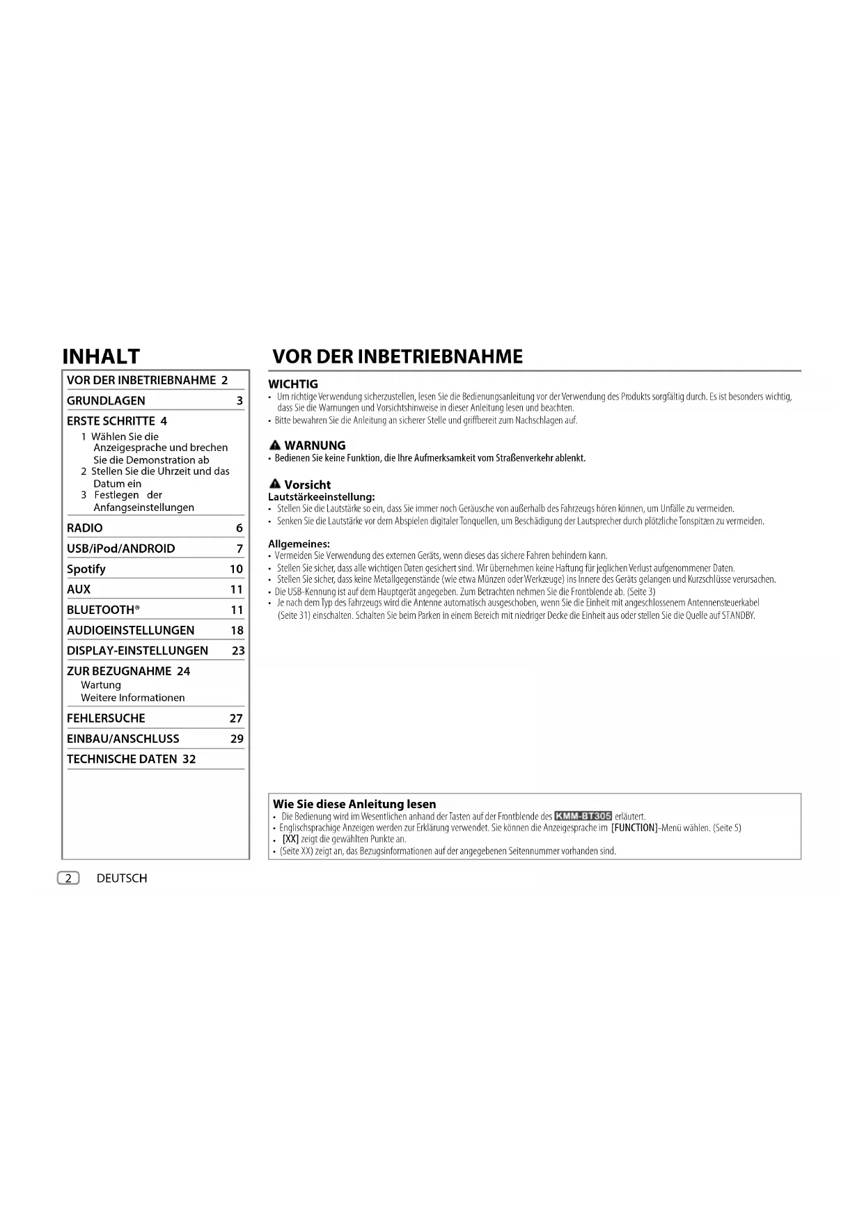 GRUNDLAGEN 3 ERSTE SCHRITTE 4 1 Wählen Sie die Anzeigesprache und brechen Sie die Demonstration ab 2 Stellen Sie die Uhrzeit und das Datum ein 3 Festlegen der Anfangseinstellungen RADIO 6 USB/iPod/ANDROID 7 Spotify 10 AUX 11 BLUETOOTH® 11 AUDIOEINSTELLUNGEN 18 DISPLAY-EINSTELLUNGEN 23 ZUR BEZUGNAHME 24 Wartung Weitere Informationen FEHLERSUCHE 27 EINBAU/ANSCHLUSS 29 TECHNISCHE DATEN 32 Wie Sie diese Anleitung lesen