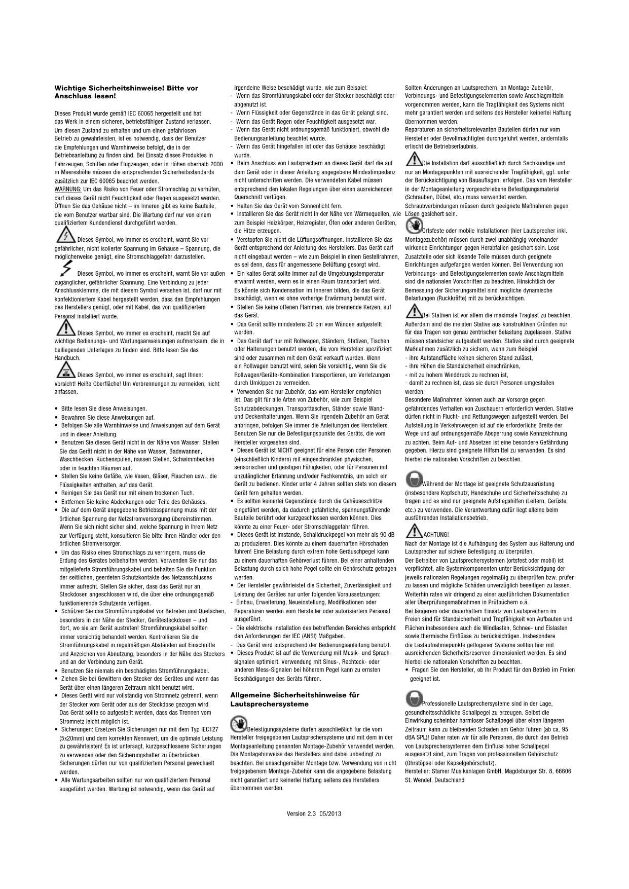 - Español• English • Deutsch • Français • ItalianoVersion 2.3 05/2013 Wichtige Sicherheitshinweise! Bitte vor Anschluss lesen! Dieses Produkt wurde gemäß IEC 60065 hergestellt und hat das Werk in einem sicheren, betriebsfähigen Zustand verlassen. Um diesen Zustand zu erhalten und um einen gefahrlosen Betrieb zu gewährleisten, ist es notwendig, dass der Benutzer die Empfehlungen und Warnhinweise befolgt, die in der Betriebsanleitung zu finden sind. Bei Einsatz dieses Produktes in Fahrzeugen, Schiffen oder Flugzeugen, oder in Höhen oberhalb 2000 m Meereshöhe müssen die entsprechenden Sicherheitsstandards zusätzlich zur IEC 60065 beachtet werden. WARNUNG: Um das Risiko von Feuer oder Stromschlag zu verhüten, darf dieses Gerät nicht Feuchtigkeit oder Regen ausgesetzt werden. Öffnen Sie das Gehäuse nicht – im Inneren gibt es keine Bauteile, die vom Benutzer wartbar sind. Die Wartung darf nur von einem qualifiziertem Kundendienst durchgeführt werden. Dieses Symbol, wo immer es erscheint, warnt Sie vor gefährlicher, nicht isolierter Spannung im Gehäuse – Spannung, die möglicherweise genügt, eine Stromschlaggefahr darzustellen. Dieses Symbol, wo immer es erscheint, warnt Sie vor außen zugänglicher, gefährlicher Spannung. Eine Verbindung zu jeder Anschlussklemme, die mit diesem Symbol versehen ist, darf nur mit konfektioniertem Kabel hergestellt werden, dass den Empfehlungen des Herstellers genügt, oder mit Kabel, das von qualifiziertem Personal installiert wurde. Dieses Symbol, wo immer es erscheint, macht Sie auf wichtige Bedienungs- und Wartungsanweisungen aufmerksam, die in beiliegenden Unterlagen zu finden sind. Bitte lesen Sie das Handbuch. Dieses Symbol, wo immer es erscheint, sagt Ihnen: Vorsicht! Heiße Oberfläche! Um Verbrennungen zu vermeiden, nicht anfassen.