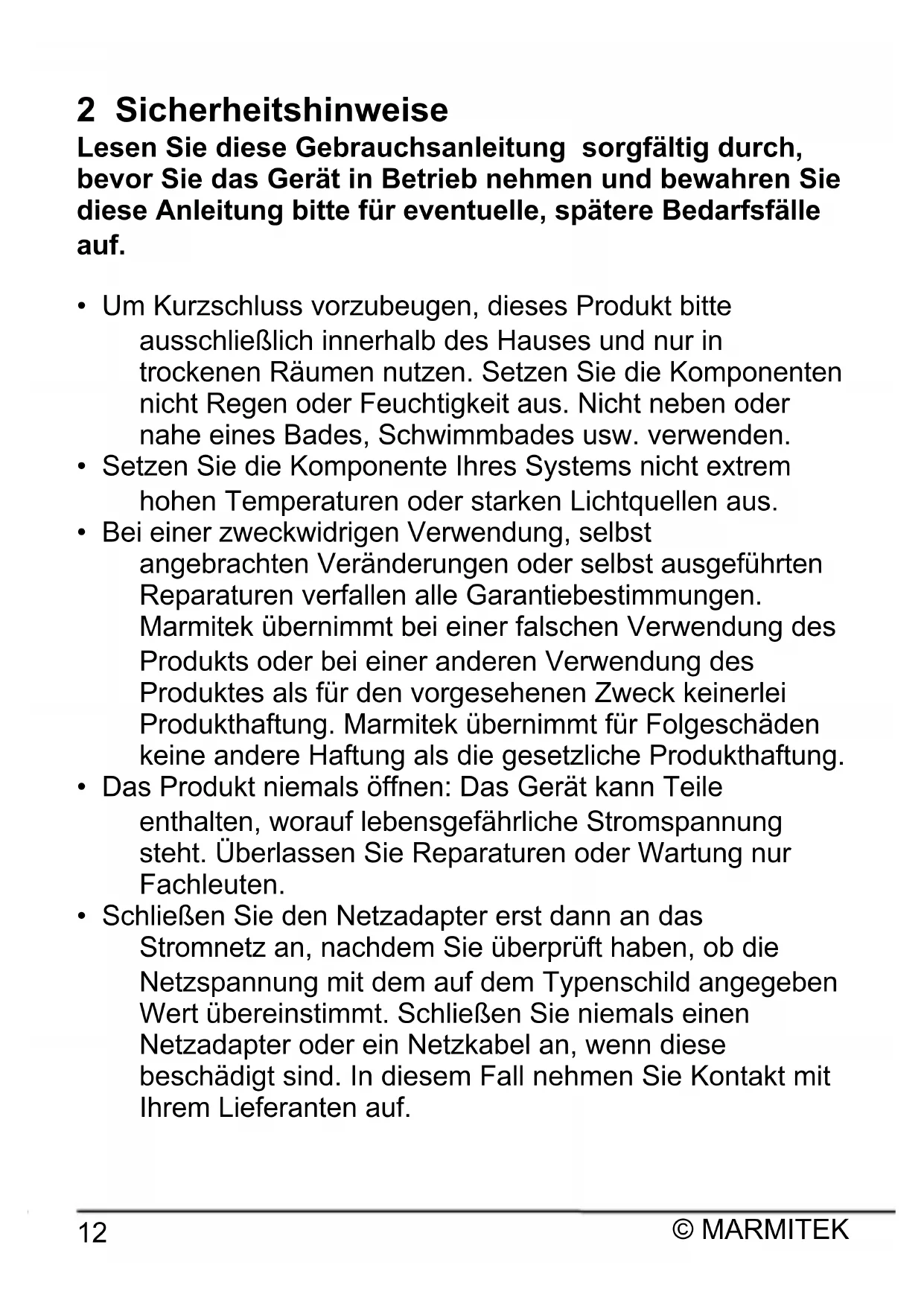 - Bei einer zweckwidrigen Verwendung, selbst angebrachten Veränderungen oder selbst ausgeführten Reparaturen verfallen alle Garantiebestimmungen. Marmitek übernimmt bei einer falschen Verwendung des Produkts oder bei einer anderen Verwendung des Produktes als für den vorgesehenen Zweck keinerlei Produkthaftung. Marmitek übernimmt für Folgeschäden keine andere Haftung als die gesetzliche Produkthaftung.