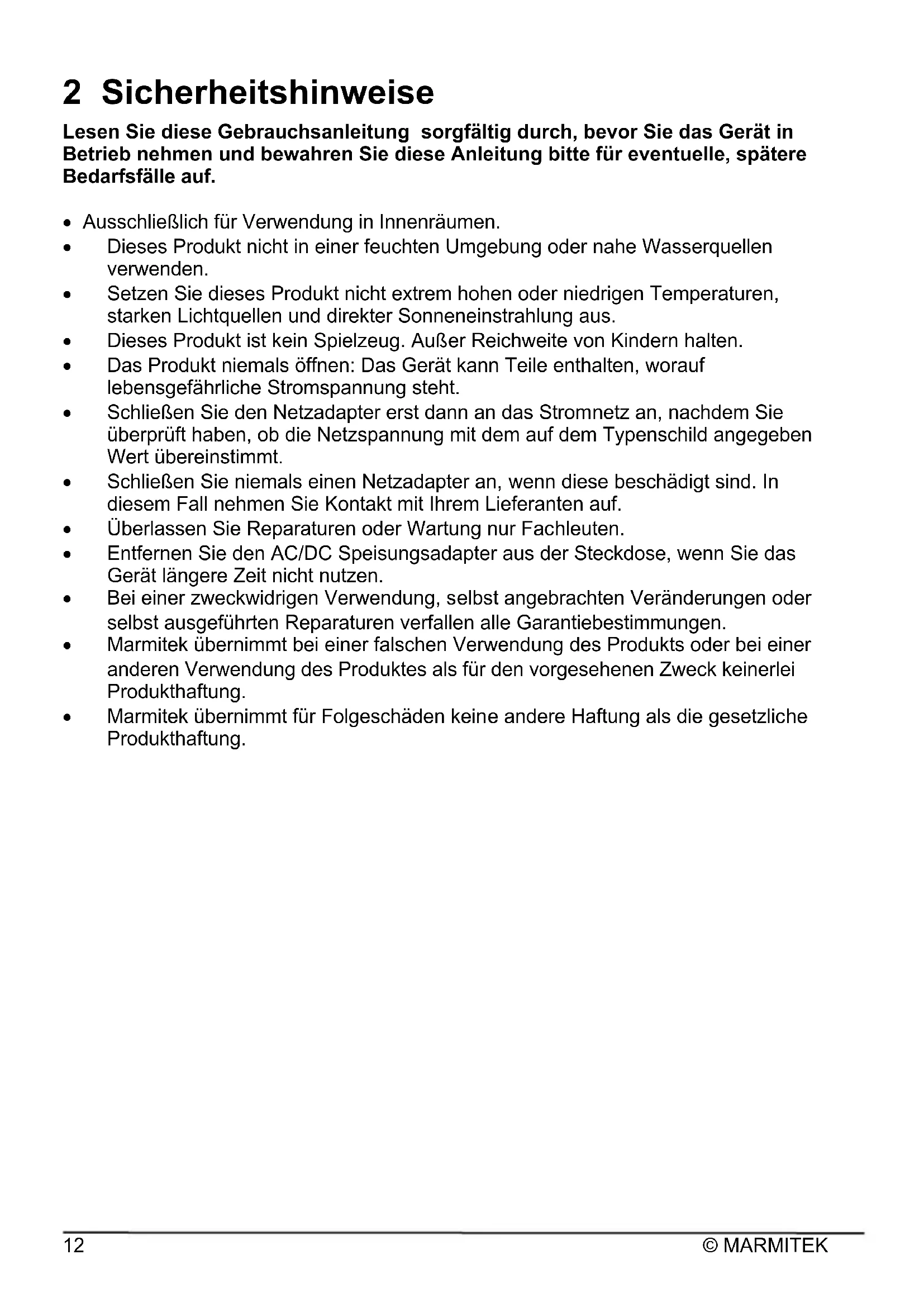 2 Sicherheitshinweise Lesen Sie diese Gebrauchsanleitung sorgfältig durch, bevor Sie das Gerät in Betrieb nehmen und bewahren Sie diese Anleitung bitte für eventuelle, spätere Bedarfsfälle auf. Ausschließlich für Verwendung in Innenräumen. Dieses Produkt nicht in einer feuchten Umgebung oder nahe Wasserquellen verwenden. Setzen Sie dieses Produkt nicht extrem hohen oder niedrigen Temperaturen, starken Lichtquellen und direkter Sonneneinstrahlung aus. Dieses Produkt ist kein Spielzeug. Außer Reichweite von Kindern halten. Das Produkt niemals öffnen: Das Gerät kann Teile enthalten, worauf lebensgefährliche Stromspannung steht. Schließen Sie den Netzadapter erst dann an das Stromnetz an, nachdem Sie überprüft haben, ob die Netzspannung mit dem auf dem Typenschild angegeben Wert übereinstimmt. Schließen Sie niemals einen Netzadapter an, wenn diese beschädigt sind. In diesem Fall nehmen Sie Kontakt mit Ihrem Lieferanten auf. Überlassen Sie Reparaturen oder Wartung nur Fachleuten. Entfernen Sie den AC/DC Speisungsadapter aus der Steckdose, wenn Sie das Gerät längere Zeit nicht nutzen. Bei einer zweckwidrigen Verwendung, selbst angebrachten Veränderungen oder selbst ausgeführten Reparaturen verfallen alle Garantiebestimmungen. Marmitek übernimmt bei einer falschen Verwendung des Produkts oder bei einer anderen Verwendung des Produktes als für den vorgesehenen Zweck keinerlei Produkthaftung. Marmitek übernimmt für Folgeschäden keine andere Haftung als die gesetzliche Produkthaftung.SPLIT 612 UHD 2.0™