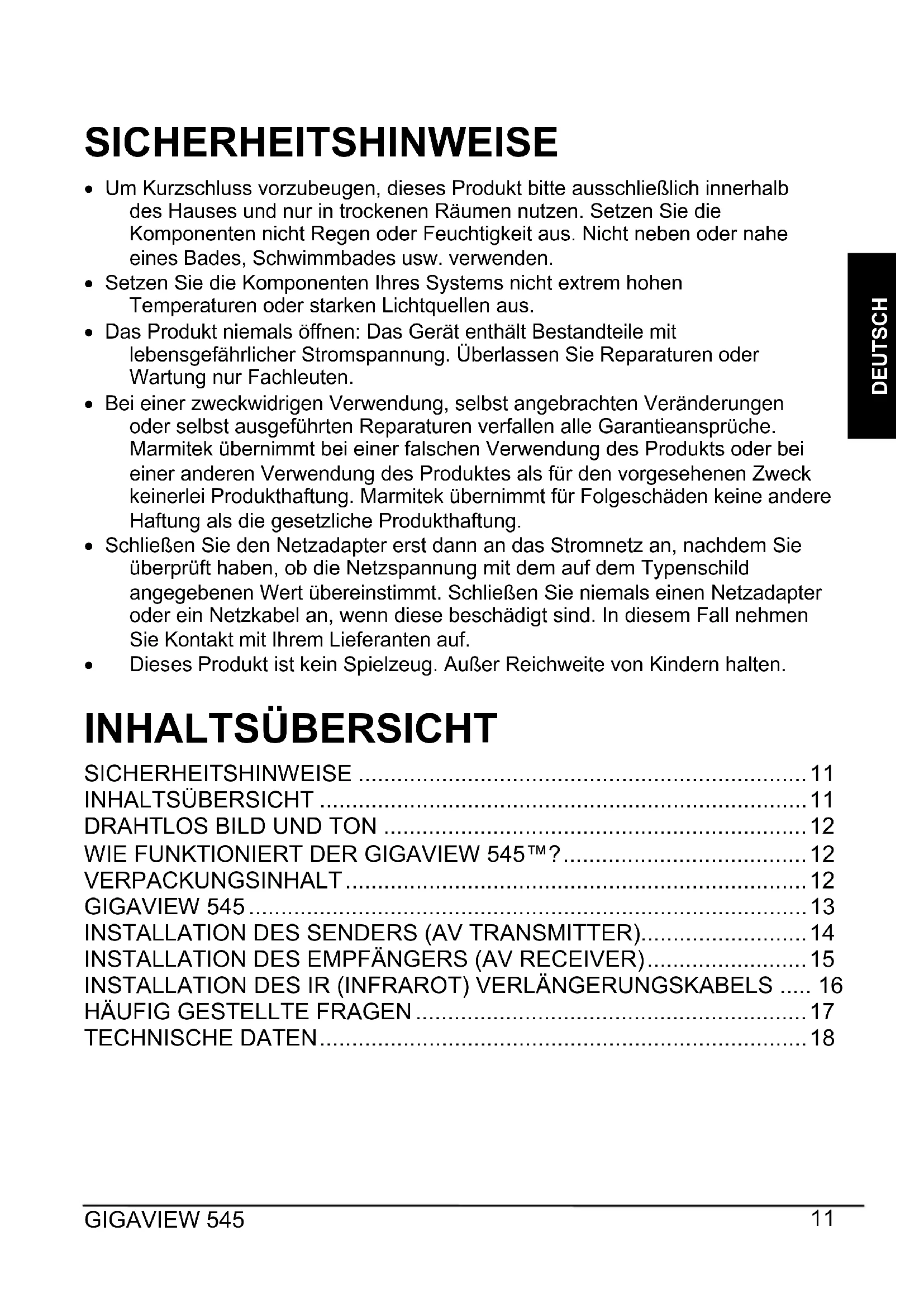 DEUTSCH SICHERHEITSHINWEISE x Um Kurzschluss vorzubeugen, dieses Produkt bitte ausschließlich innerhalb des Hauses und nur in trockenen Räumen nutzen. Setzen Sie die Komponenten nicht Regen oder Feuchtigkeit aus. Nicht neben oder nahe eines Bades, Schwimmbades usw. verwenden. x Setzen Sie die Komponenten Ihres Systems nicht extrem hohen Temperaturen oder starken Lichtquellen aus. x Das Produkt niemals öffnen: Das Gerät enthält Bestandteile mit lebensgefährlicher Stromspannung. Überlassen Sie Reparaturen oder Wartung nur Fachleuten. x Bei einer zweckwidrigen Verwendung, selbst angebrachten Veränderungen oder selbst ausgeführten Reparaturen verfallen alle Garantieansprüche. Marmitek übernimmt bei einer falschen Verwendung des Produkts oder bei einer anderen Verwendung des Produktes als für den vorgesehenen Zweck keinerlei Produkthaftung. Marmitek übernimmt für Folgeschäden keine andere Haftung als die gesetzliche Produkthaftung. x Schließen Sie den Netzadapter erst dann an das Stromnetz an, nachdem Sie überprüft haben, ob die Netzspannung mit dem auf dem Typenschild angegebenen Wert übereinstimmt. Schließen Sie niemals einen Netzadapter oder ein Netzkabel an, wenn diese beschädigt sind. In diesem Fall nehmen Sie Kontakt mit Ihrem Lieferanten auf. x Dieses Produkt ist kein Spielzeug. Außer Reichweite von Kindern halten. INHALTSÜBERSICHT SICHERHEITSHINWEISE ...................................................................... 11 INHALTSÜBERSICHT ............................................................................ 11