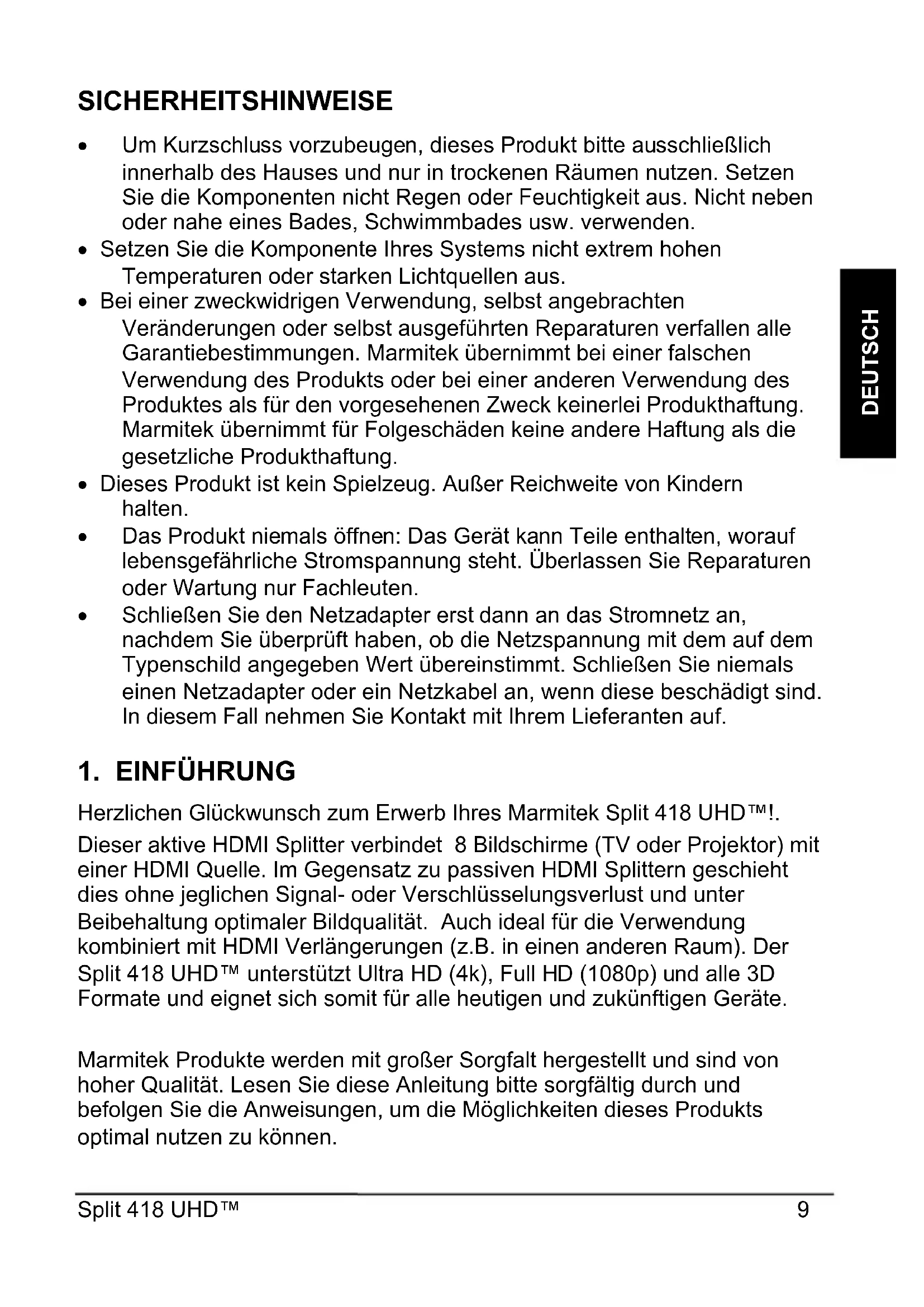 Herzlichen Glückwunsch zum Erwerb Ihr's Marmitek Split 418 UHD™!. Dieser aktive HDMI Splitter verbindet 8 Bildschirme (TV oder Projektor) mit einer HDMI Quelle. Im Gegensatz zu passiven HDMI Splittern geschieht dies ohne jeglichen Signal- oder Verschlussungsverlust und unter Beibehaltung optimaler Bildqualität. Auch ideal für die Verwendung kombiniert mit HDMI Veränderungen (z.B. in einen anderen Raum). Der Split 418 UHD™ unterstützt Ultra HD (4k), Full HD (1080p) und alle 3D Formate und eignet sich somit für alle heutigen und zukünftigen Geräte.